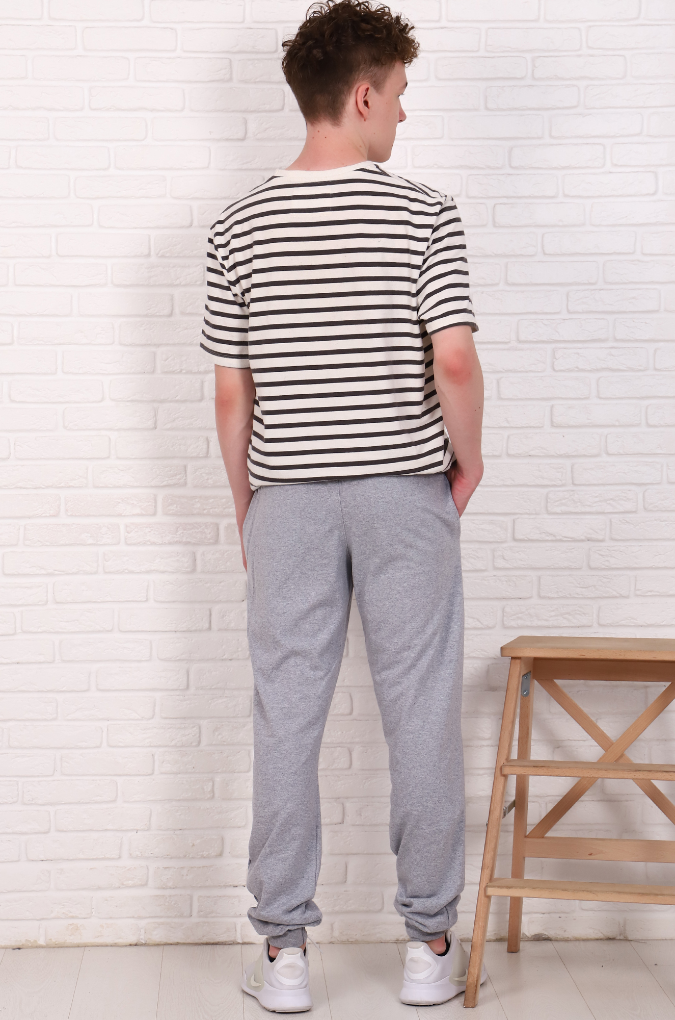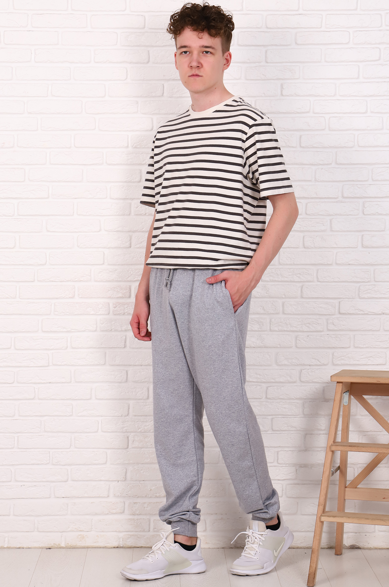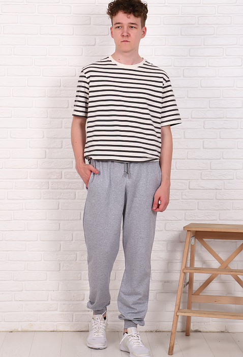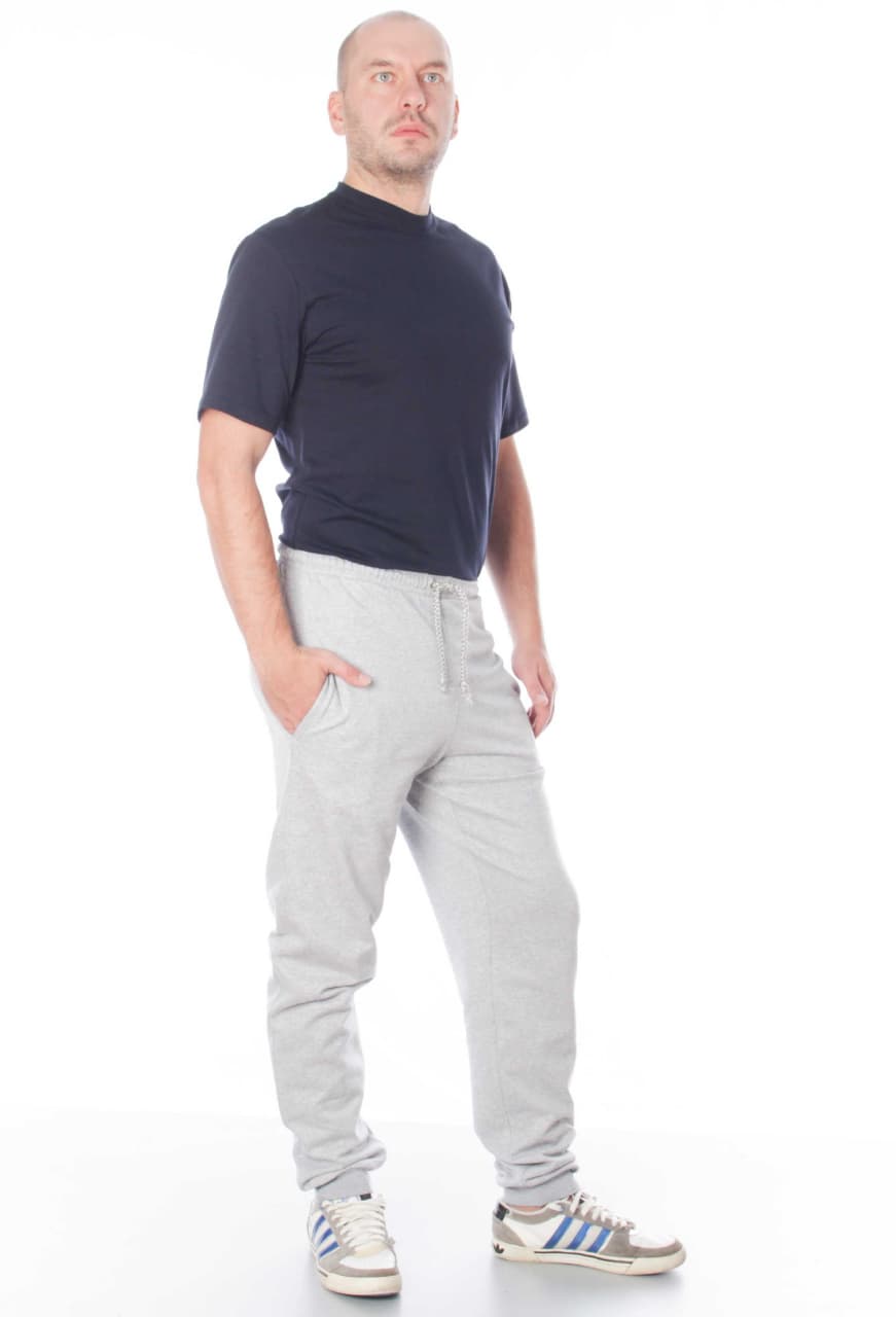 Мужские спортивные брюки на манжетах из облегчённого футера с небольшим начесом, плотностью 190 г/м2. Пояс на резинке и шнурок, боковые карманы.
