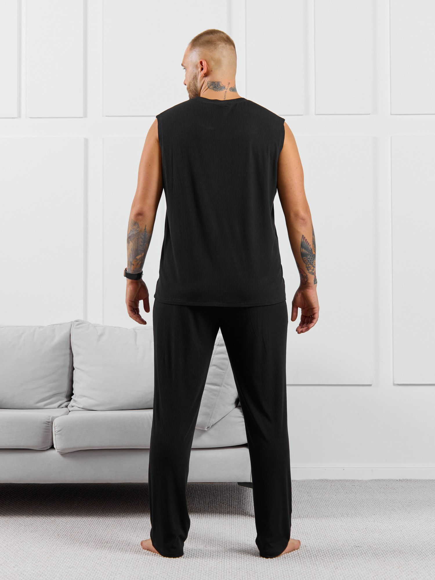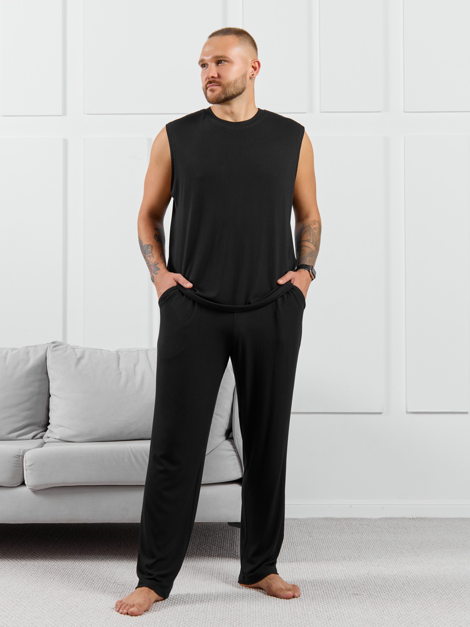 Брюки мужские из пластичного однотонного трикотажного полотна в рубчик, приятного к телу. Модель свободная, прямого силуэта, с боковыми карманами с обтачными входами, на притачном поясе с отстроченной эластичной тесьмой.