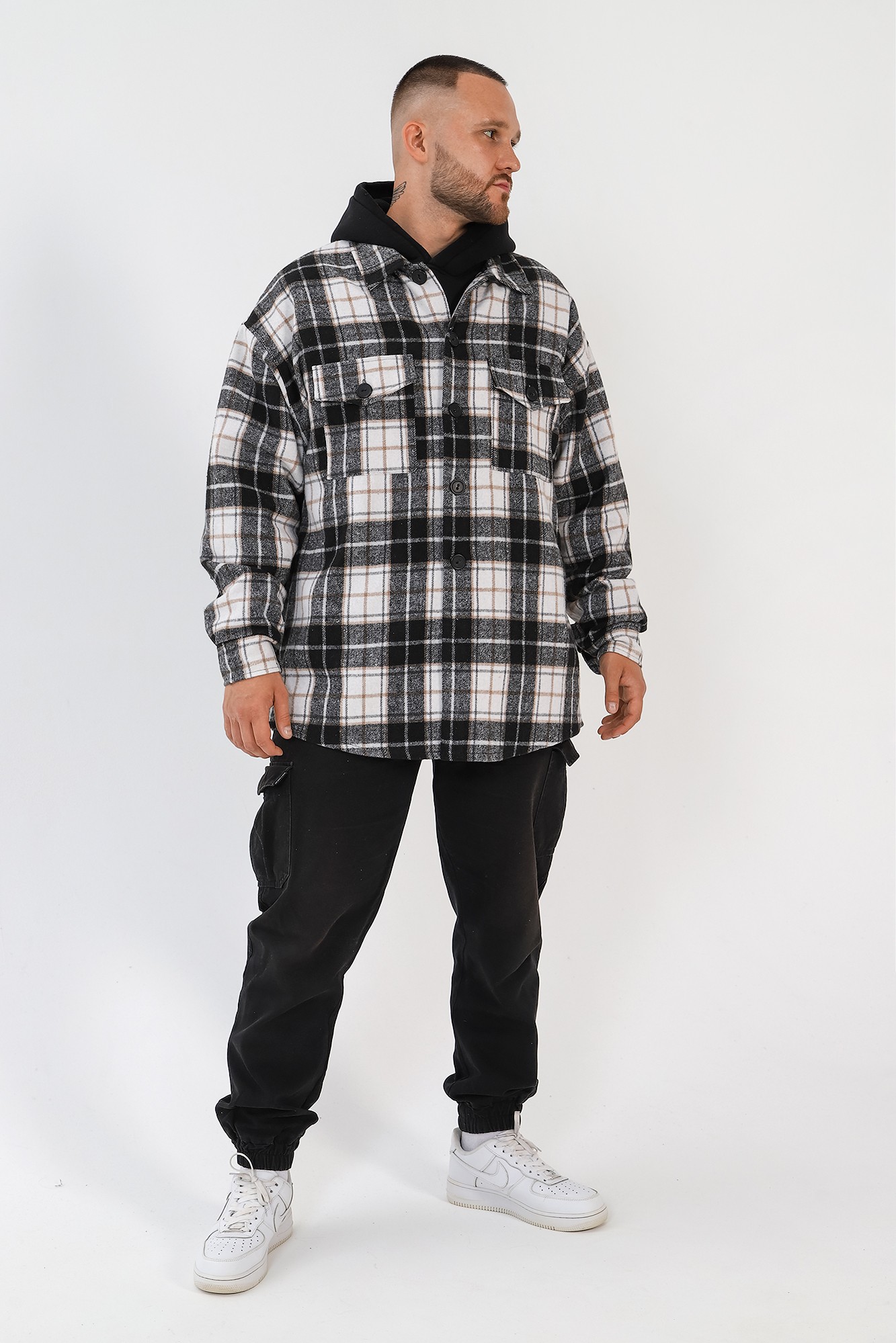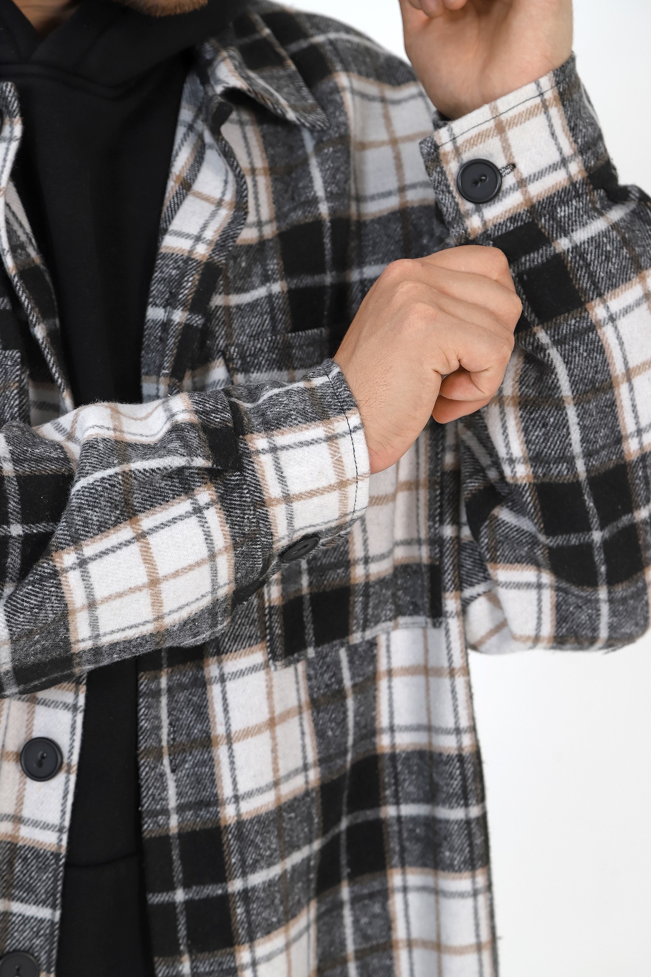 Рубашка мужская из тканого полотна с рисунком в крупную клетку, длинными втачными рукавами с разрезами на притачных манжетах, застегивающимися на обметанные петли и пуговицы, фигурной линией низа и стояче-отложным воротником. Полочки - с двумя нагрудными карманами и клапанами фигурной формы. Спинка - с притачной кокеткой, выкроенной по косой. В швах соединения манжет с рукавами обработаны по одной складочке. При эксплуатации изделия следует обратить внимание на то, что после ВТО и стирки материал дает усадку по ширине и длине.