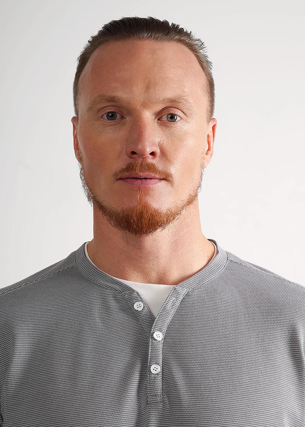 "Описание: Мужской лонгслив из трикотажного фактурного полотна с длинным рукавом и декоративной планкой на пуговицах. Контрастная отделка горловины акцент. Удобная и стильная модель для повседневного образа.