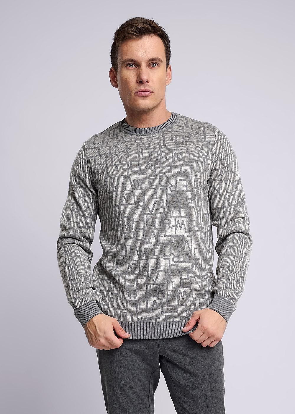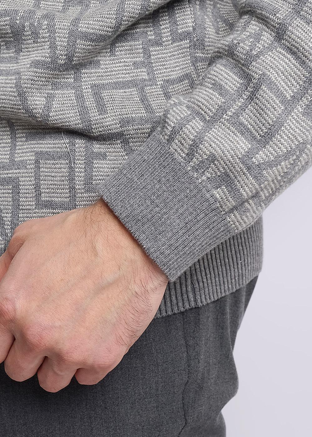 "Описание: Джемпер мужской вязаный с круглым вырезом горловины и длинным втачным рукавом. Изделие из смесовой пряжи с шрифтовым жаккардовым переплетением, дополнена фирменной фурнитурой. Модель универсальна, поэтому подойдет к любому низу.