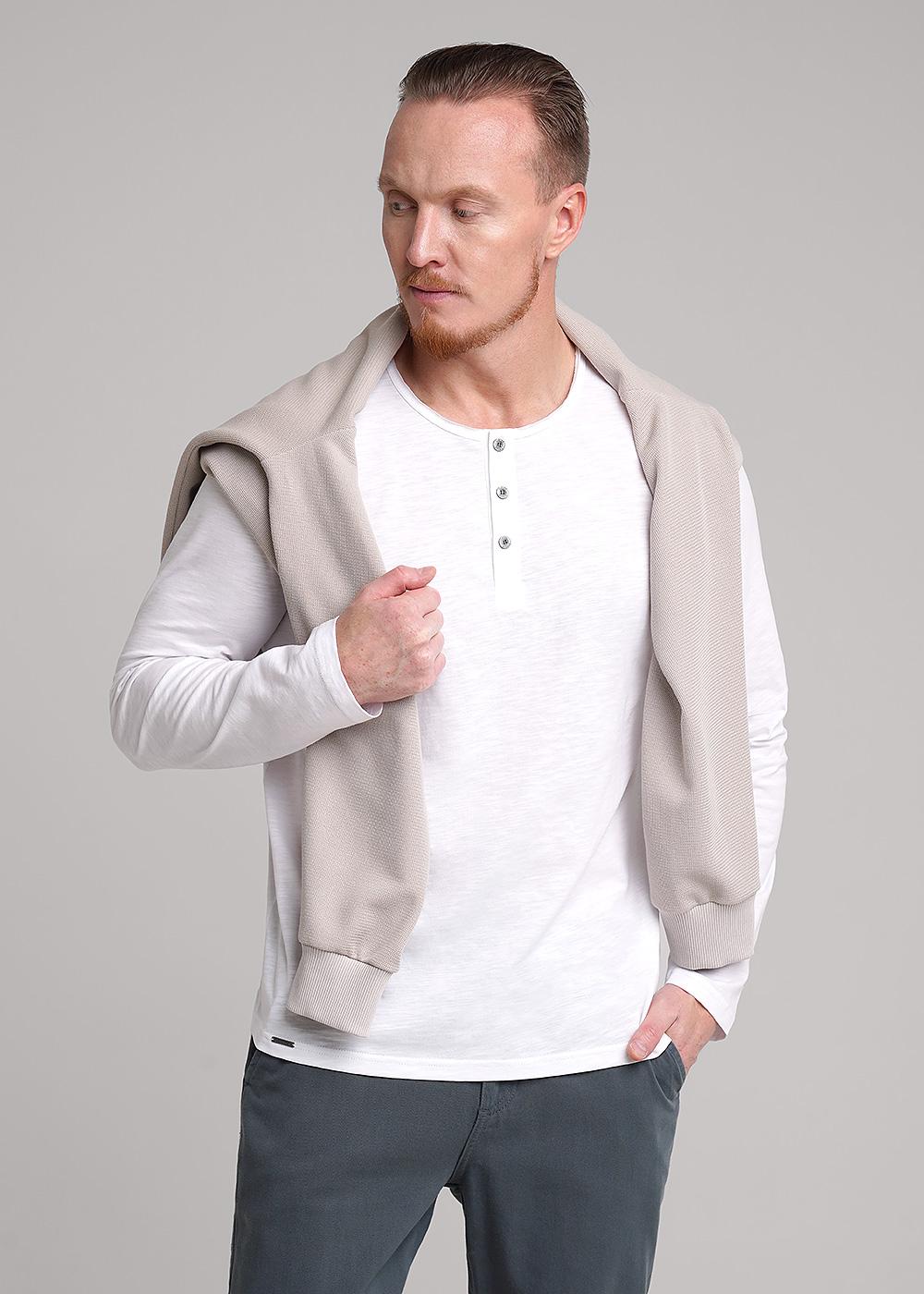 "Описание: Лонгслив мужской с длинным рукавом, округлой необработанной горловиной на планке из фактурного полотна флам. Изделие дополнено имиджевой фурнитурой. Данная модель прекрасно комбинируется с джинсами или шортами благодаря своей универсальности.