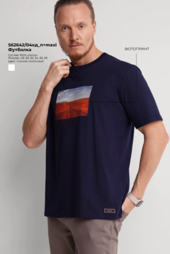 "Описание: Стильная мужская футболка из трикотажа с 100% хлопковым составом. Модель с круглым вырезом горловины и коротким рукавом, дополнена фотографичным принтом, что придает ей оригинальности. Изделие подойдет для активных прогулок и встреч.