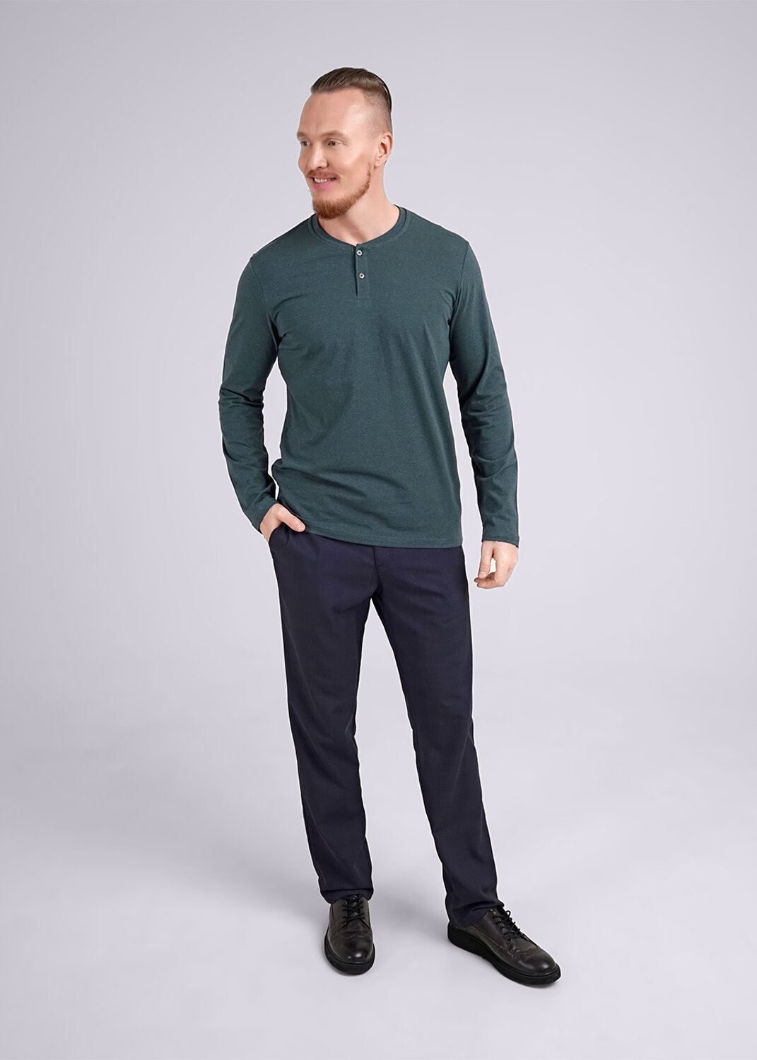 Лонгслив из трикотажного полотна с удобной планкой на пуговицы. Данный лонгслив прекрасное дополнение к брюкам или джинсам. Прекрасно подойдёт для встречи с друзьями или похода на работу.