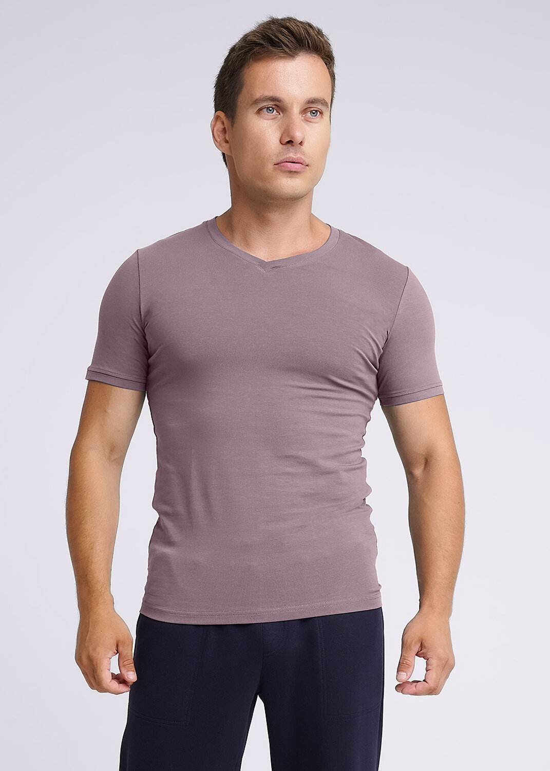 Фуфайка базовой посадки, v-образный вырез горловины, короткий рукав.
