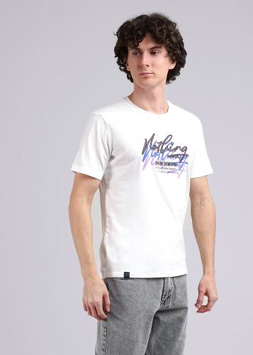 Мужская футболка из дышащего полотна с большим содержанием хлопка и минимальным добавлением эластана. Изделие дополнено абстрактным шрифтовым принтом. Отличный вариант для динамичных мужчин.