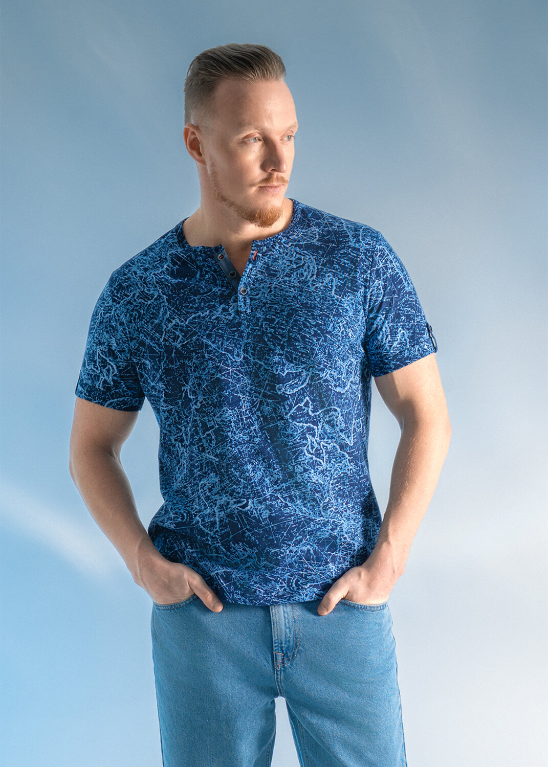 Мужская футболка из хлопкового трикотажного полотна "флам" с круглой горловиной и планкой на пуговицах, с коротким втачным рукавом. Модель дополнена имиджевой фурнитурой.