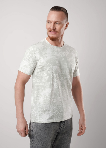 Мужская футболка из трикотажного полотна с абстрактной набивкой, прекрасное решение для похода на работу или прогулки с друзьями. Данная модель отлично впишется в любой гардероб и составит комплект с брюками или джинсами.