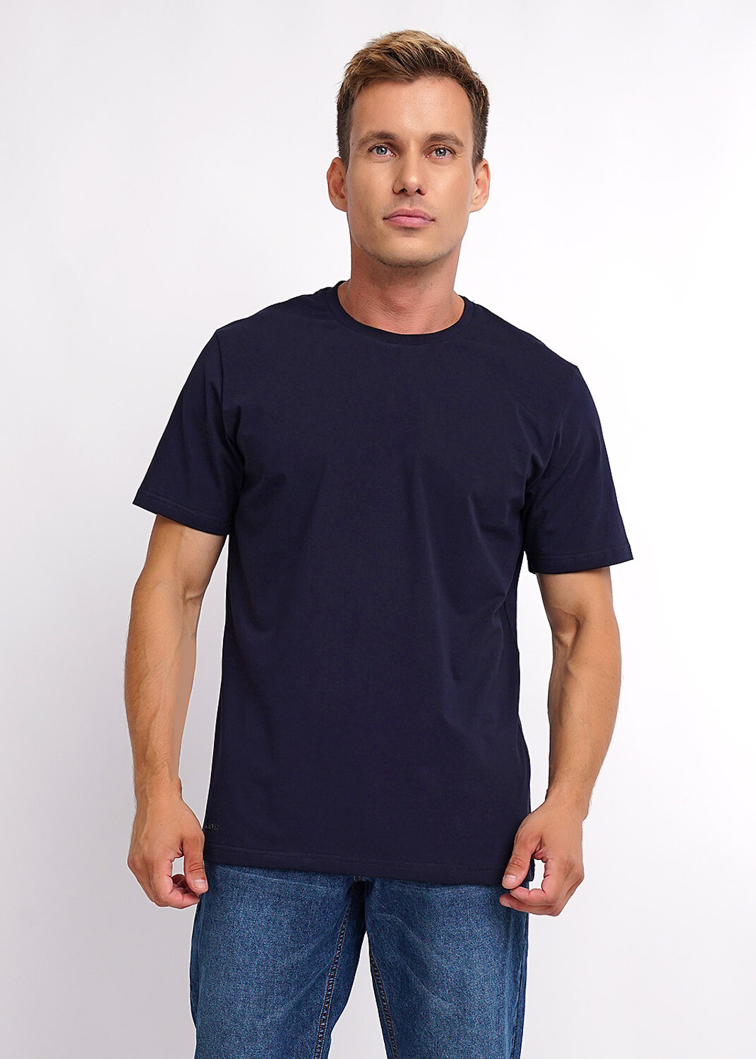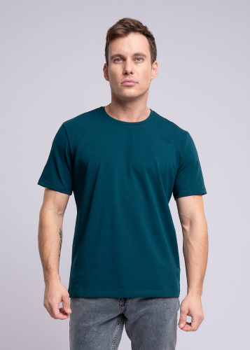 Базовая однотонная футболка стандартного объема с круглой горловиной, втачным рукавом из хлопкового полотна с добавлением эластана. Является неотъемлемой частью мужского гардероба.