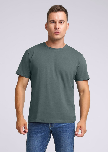 Базовая однотонная футболка стандартного объема с круглой горловиной, втачным рукавом из хлопкового полотна с добавлением эластана. Является неотъемлемой частью мужского гардероба.