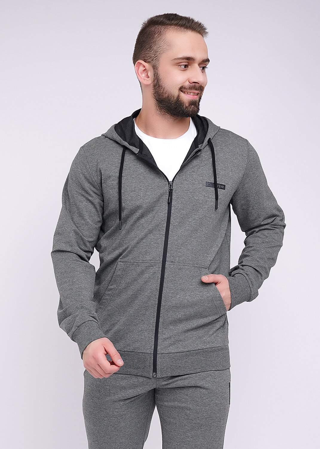Модная куртка с капюшоном на молнии из плотного трикотажного полотна будет незаменимой вещью в гардеробе любого мужчины, благодаря функциональным карманам "кенгуру" и стильной отделке в виде нашивок.