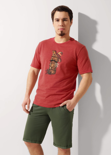 Набор мужской для дома состоящий из футболки и шорт. Футболка из однотонной кулирной глади с круглым вырезом горловины, декоративным резом, коротким рукавом и стильным принтом. Шорты из футера на эластичном поясе с функциональными карманами и шнуром.