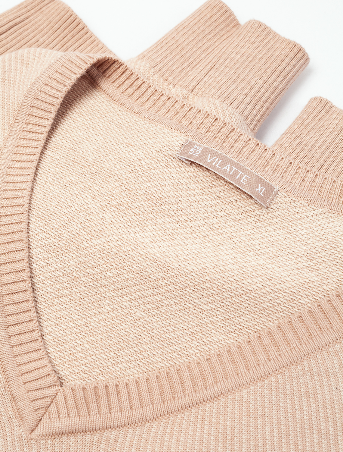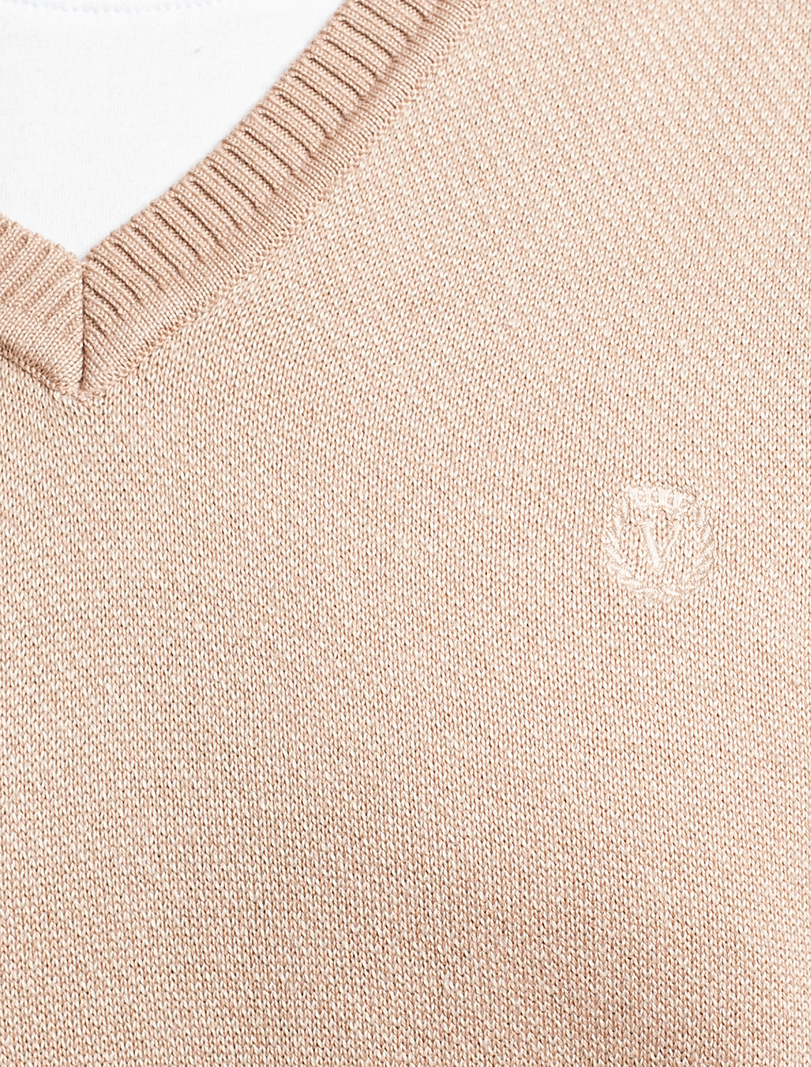 Для изготовления бежевого джемпера с клиновидным вырезом и длинными рукавами использовали пряжу из премиального хлопка с акрилом. У модели получилась очень мягкая и приятная на ощупь фактура из переплетения нитей нескольких цветов. Изделие комфортно носить даже на голое тело или дополнив образ футболкой. Роскоши вносит вышитый логотип бренда.