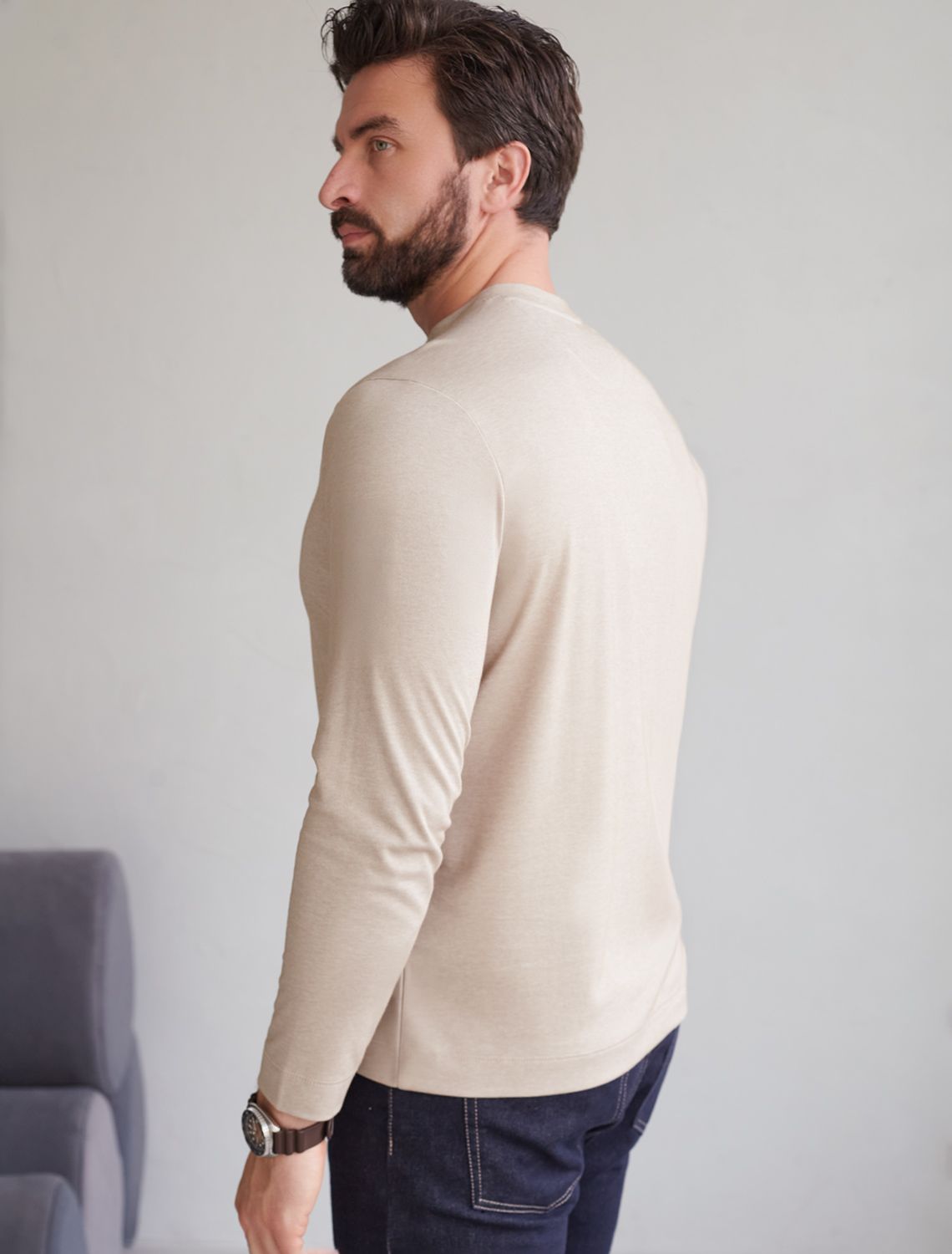 Джемпер хенли темно-бежевого цвета из полотна пике, состоящий из двух оттенков нити, создающем эффект меланж. Мягкая и дышащая ткань обеспечивает комфорт в течение всего дня, позволяя коже дышать и поддерживать оптимальную воздухопроницаемость. Материал тянется, обеспечивает долговечность и сохраняет презентабельный внешний вид даже после многократных стирок.