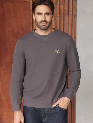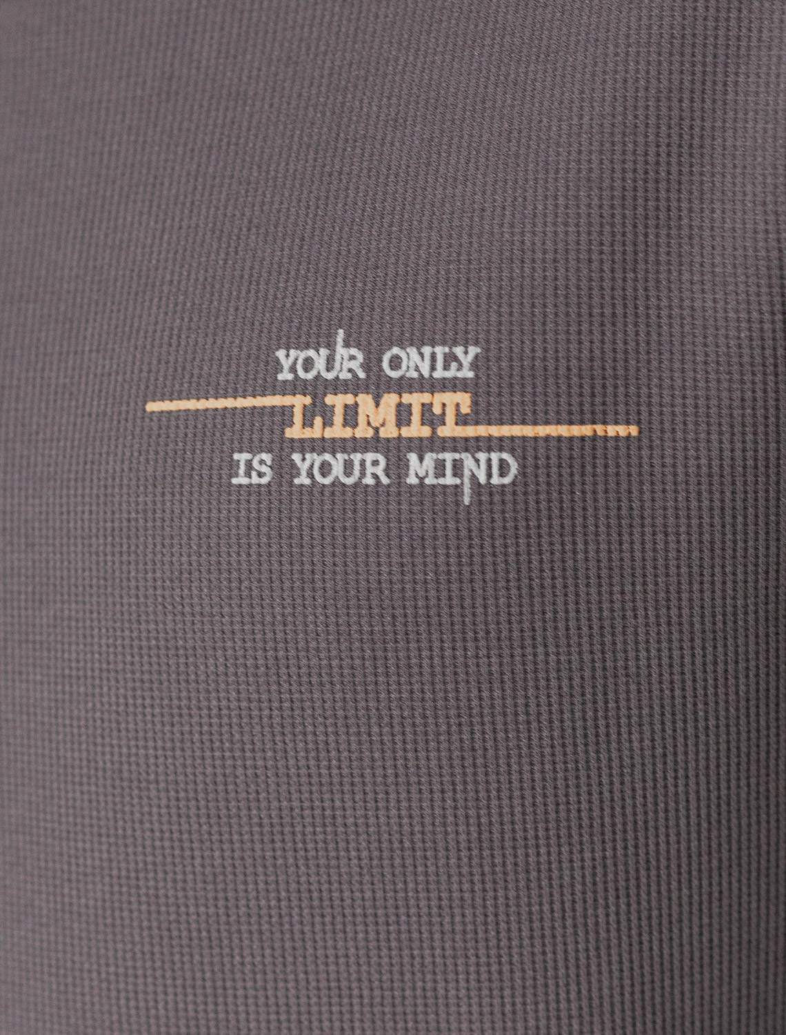 Легкий и невероятно комфортный джемпер серого цвета создан для повседневного образа. Мягкий фактурный эластичный трикотаж приятно ощущается на теле, не сковывает движения и отлично подходит для носки в любое время года. Полуприлегающий крой обеспечивает свободу и удобство, позволяя выглядеть стильно и чувствовать себя уверенно каждый день. Круглый ворот украшен декоративной нашивкой в виде перевернутого треугольника, добавляющей оригинальности.. Манжеты на рукавах и по низу аккуратно оформлены, что придает завершенность внешнему виду и способствует сохранению формы джемпера после длительной носки и многочисленных стирок. Принт в виде небольшой надписи добавляет яркости, подчеркивая индивидуальность каждого мужчины. Перевод надписи: Уour only limit is your mind - Твой единственный предел — твой разум.