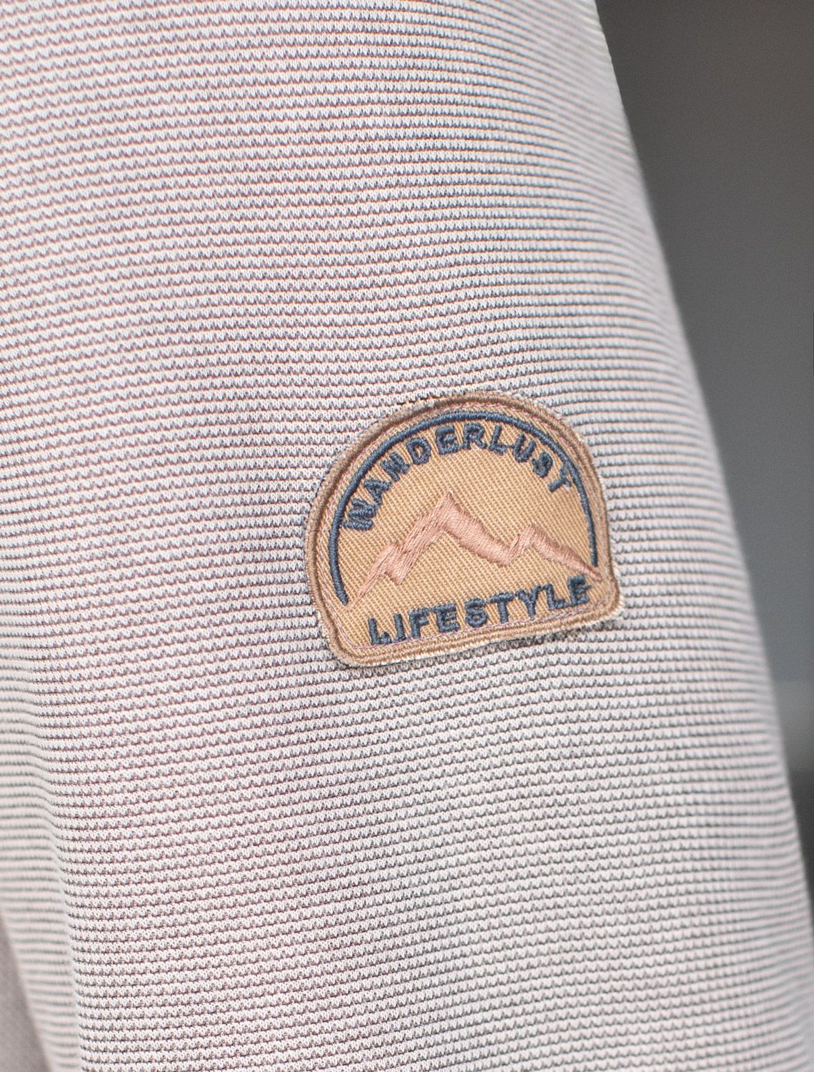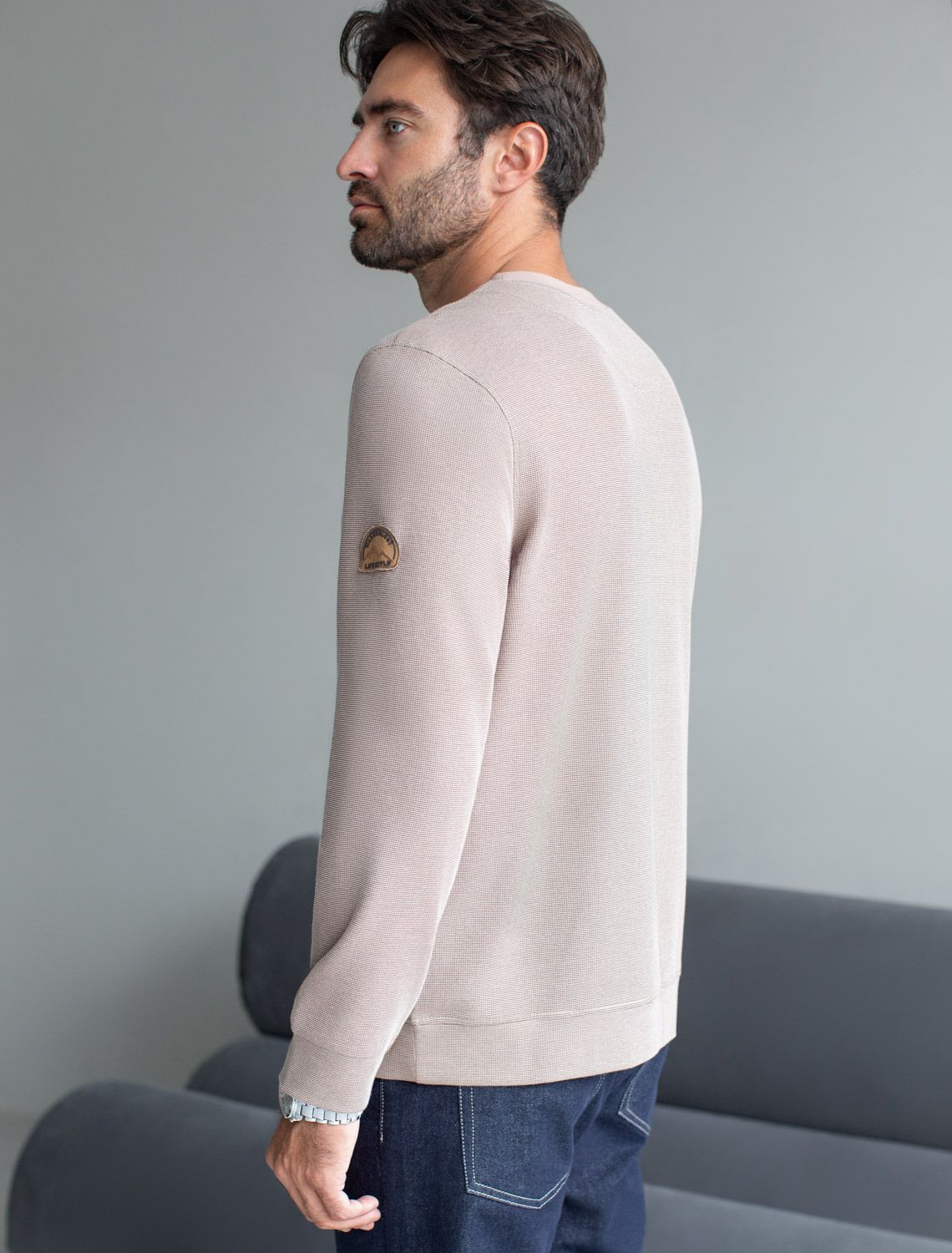 Легкий и невероятно комфортный джемпер коричневого цвета создан для повседневного образа. Мягкий фактурный эластичный трикотаж приятно ощущается на теле, не сковывает движения и отлично подходит для носки в любое время года. Полуприлегающий крой обеспечивает свободу и удобство, позволяя выглядеть стильно и чувствовать себя уверенно каждый день. Круглый ворот украшен декоративной нашивкой в виде перевернутого треугольника, добавляющей оригинальности.. Манжеты на рукавах и по низу аккуратно оформлены, что придает завершенность внешнему виду и способствует сохранению формы джемпера после длительной носки и многочисленных стирок. На груди нашивка из экокожи в виде логотипа бренда, подчеркивающая индивидуальность каждого мужчины.