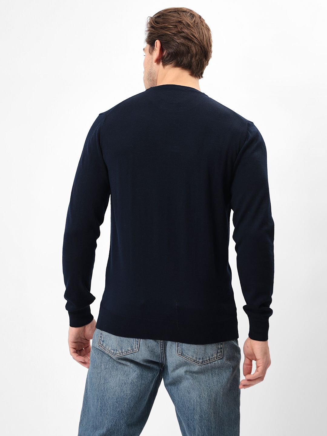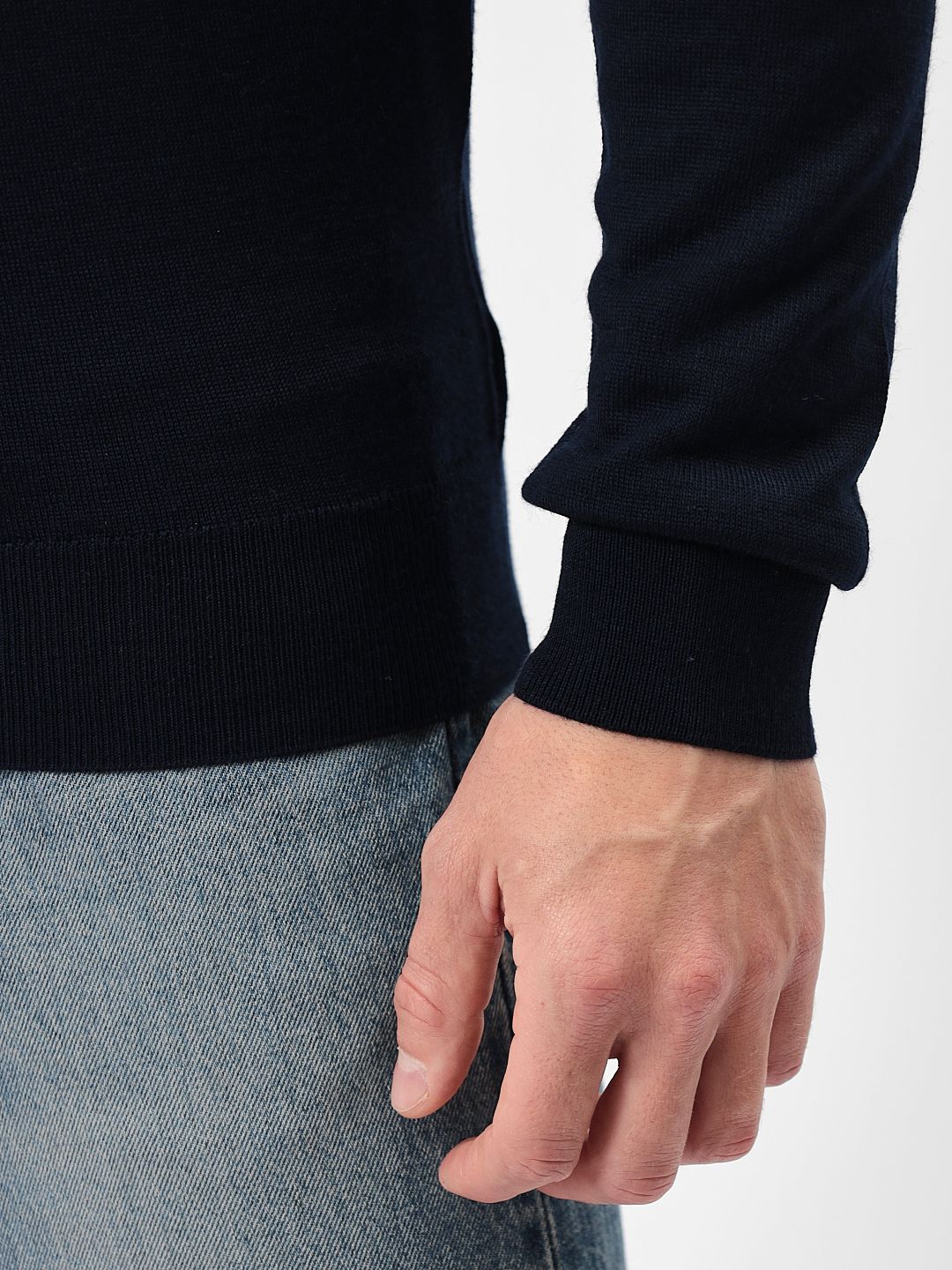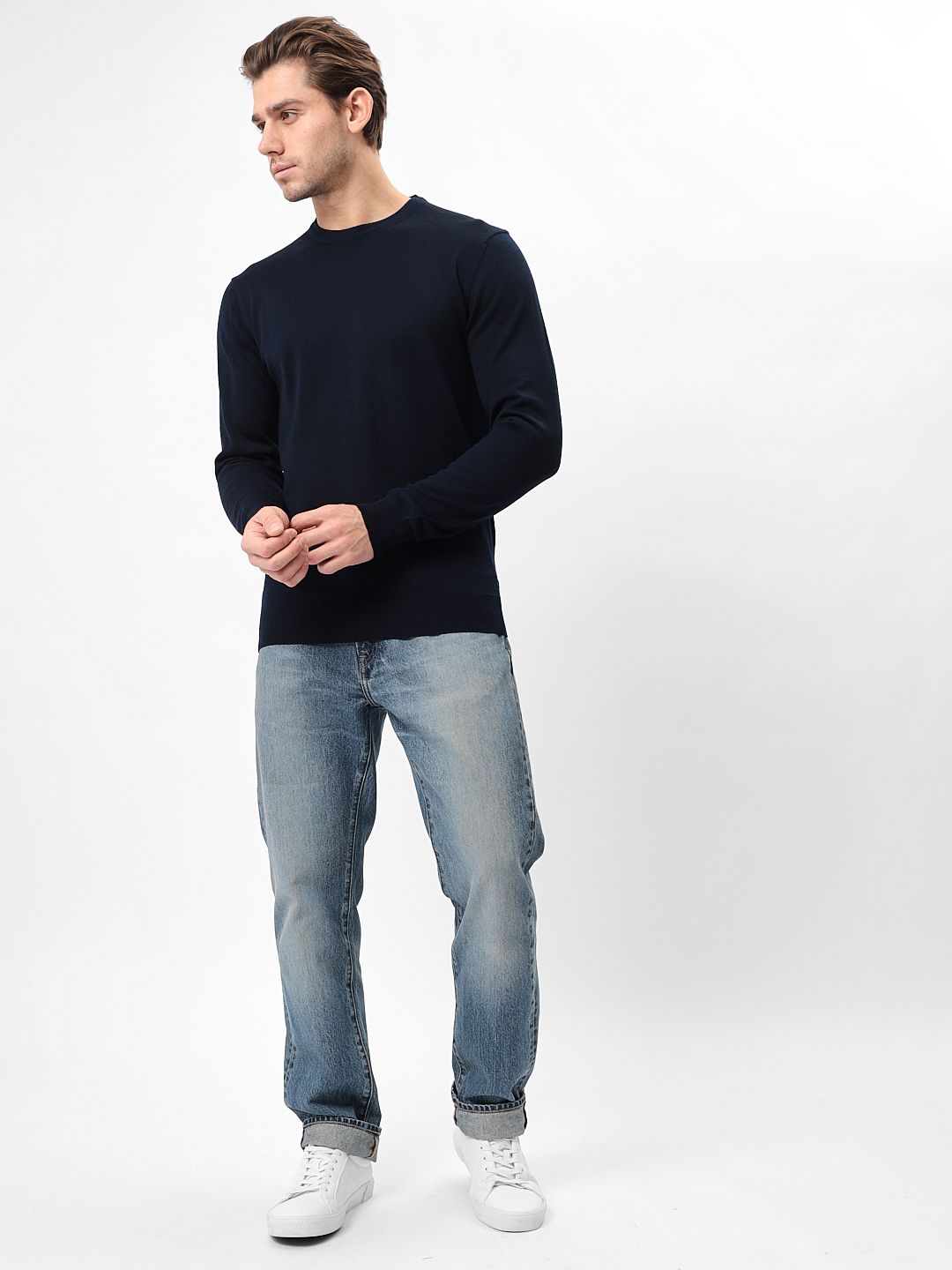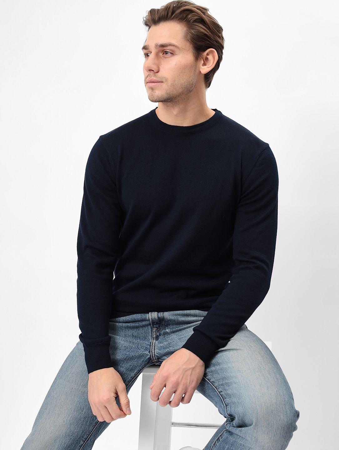 Цвет: Синий Рисунок: Трикотаж одн..показатьотонный Состав: 80% шерсть мериноса 20% акрил Модель: Классическая Ворот: Круглый Караман: отсутствует Силуэт: Прямой силуэт / Сlassic fitотонный
