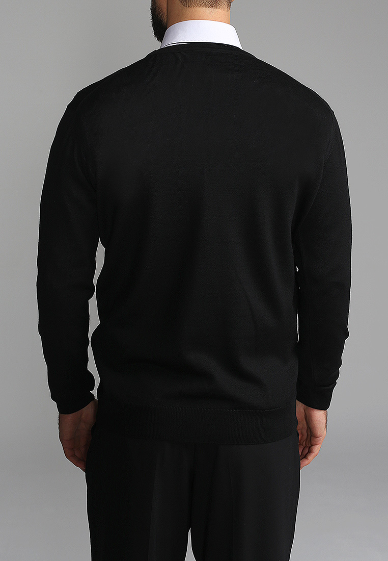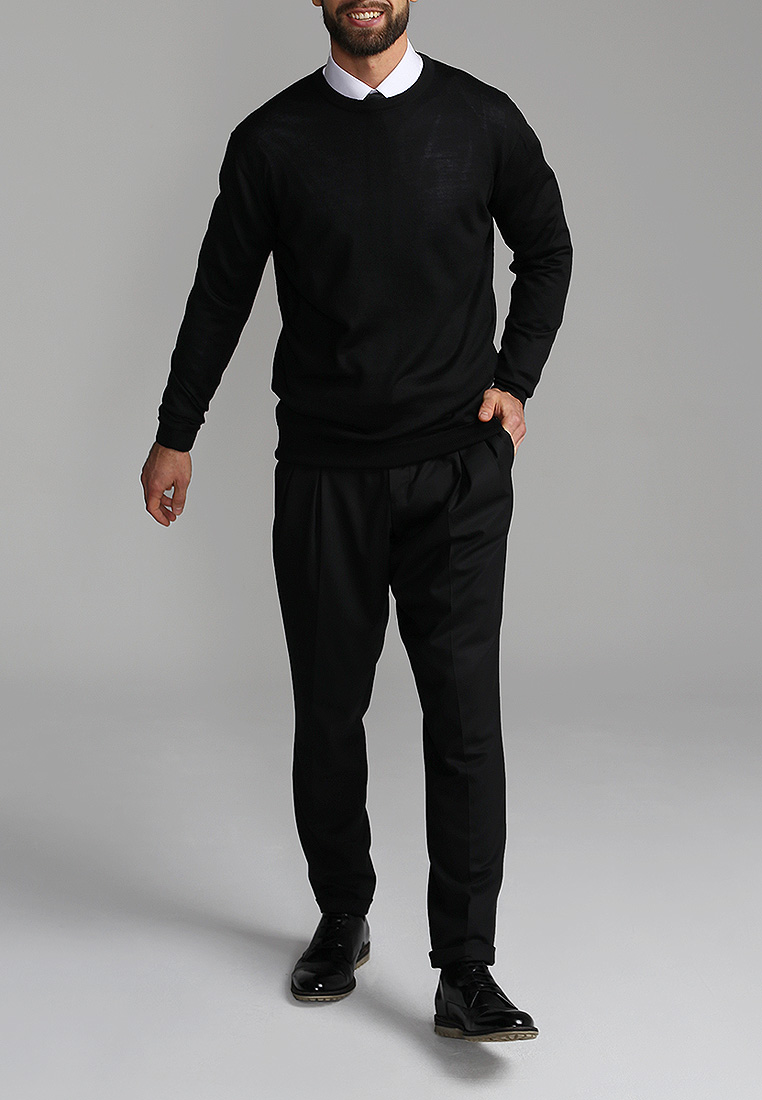 Цвет: Черный Рисунок: Трикотаж од..показатьнотонный Состав: 80% шерсть мериноса 20% акрил Модель: Классическая Ворот: Круглый Силуэт: Прямой силуэт / Сlassic fitнотонный