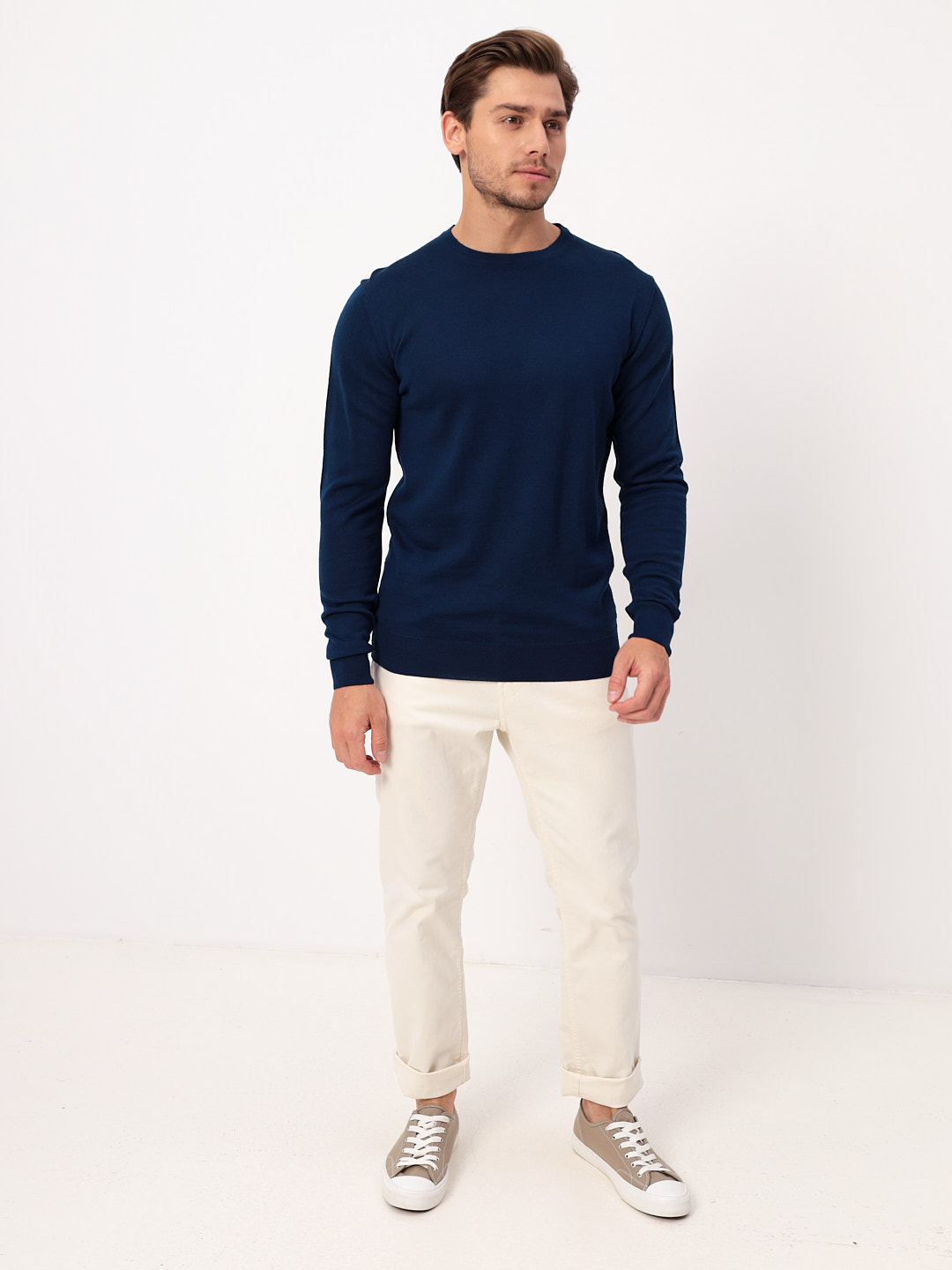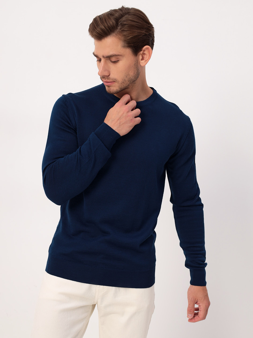 Цвет: Синий Рисунок: Трикотаж одн..показатьотонный Состав: 80% шерсть мериноса 20% акрил Модель: Классическая Ворот: Круглый Силуэт: Прямой силуэт / Сlassic fitотонный