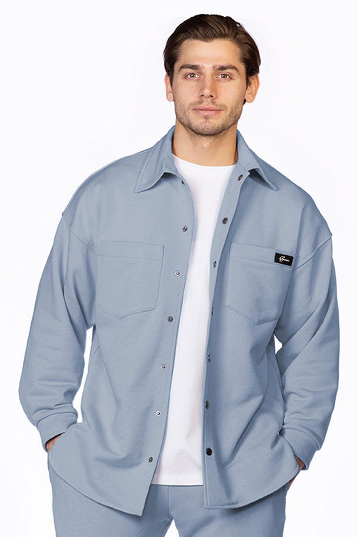 Рубашка свободного кроя, со спущенной линией плеча, застегивается на кнопки. Накладные карманы без клапана, декорированы именным шевроном с логотипом Ezanna. Брюки прямого без манжетов по низу, чуть зауженного кроя, пояс выполнен из эластичного кашкорсе, удобные боковые карманы.