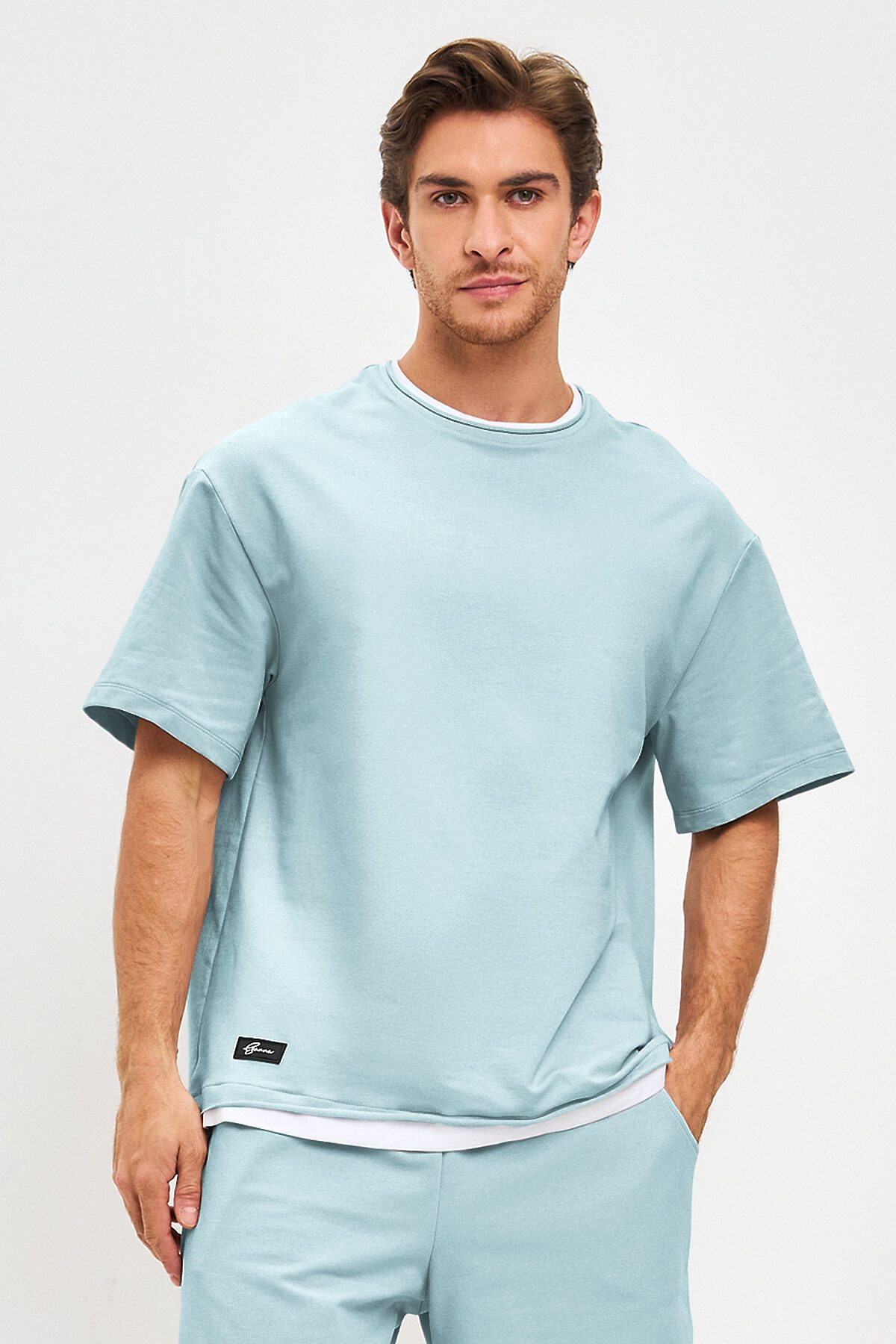 Футболка свободного кроя, с рукавом до локтя и круглым вырезом горловины. Декорирована именным шевроном с логотипом Ezanna. Имитация многослойности, за счет эффекта "выглядывания" белой футболки снизу.