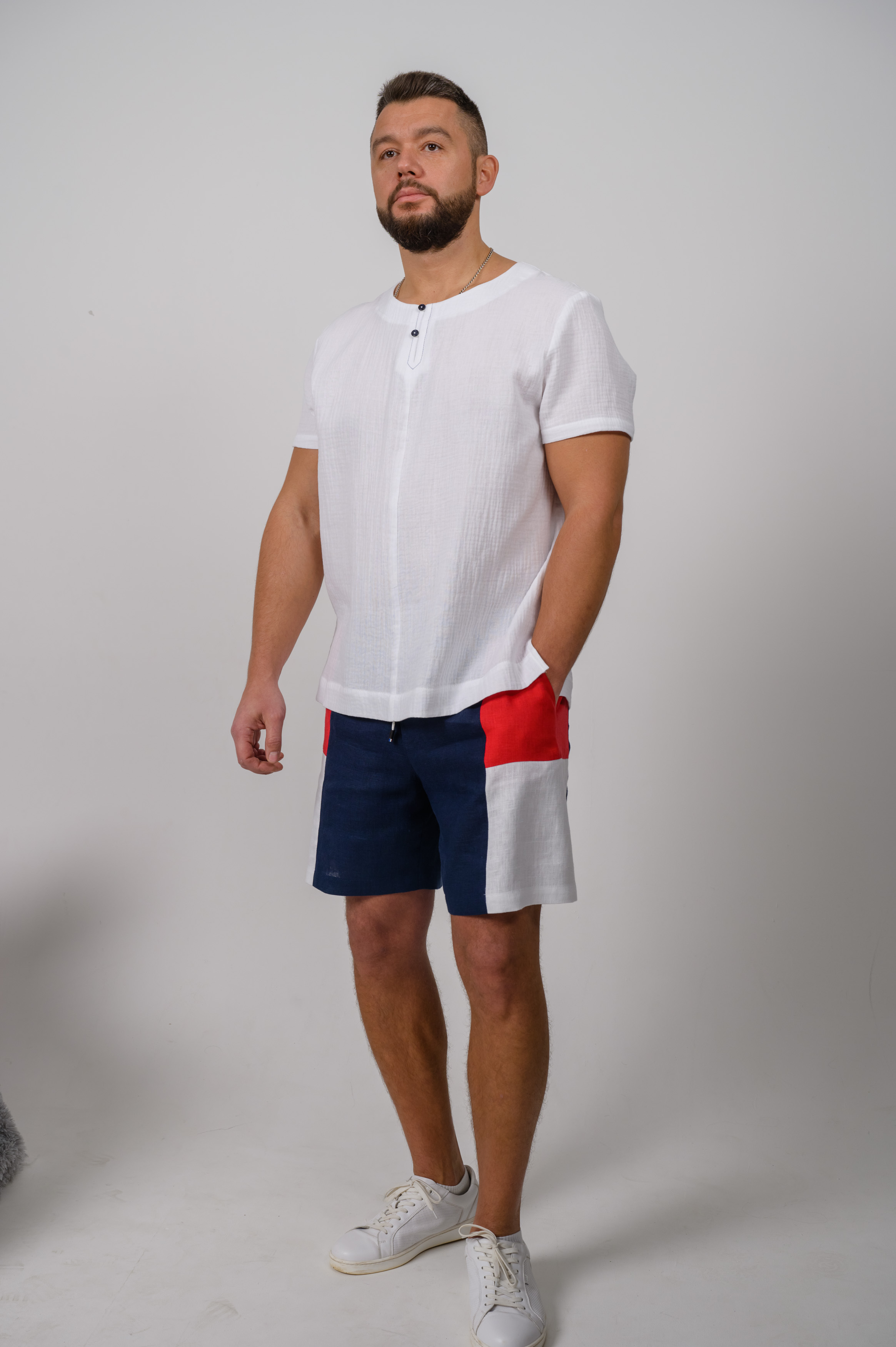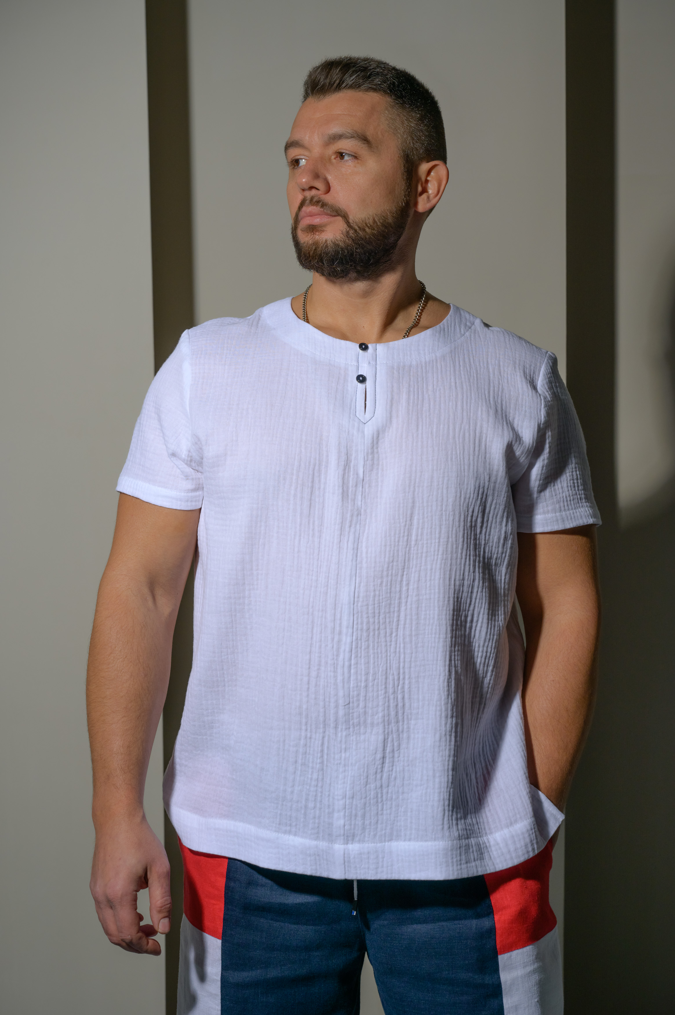 Летняя мужская футболка из муслина. Силуэт сводный, по передней части застежка на пуговицы.  Муслин не образует скатывания, устойчив к многократным циклам стирки, обладает отличной воздухопроницаемостью. Структура ткани «гофре» позволяет не утюжить изделие после стирки.