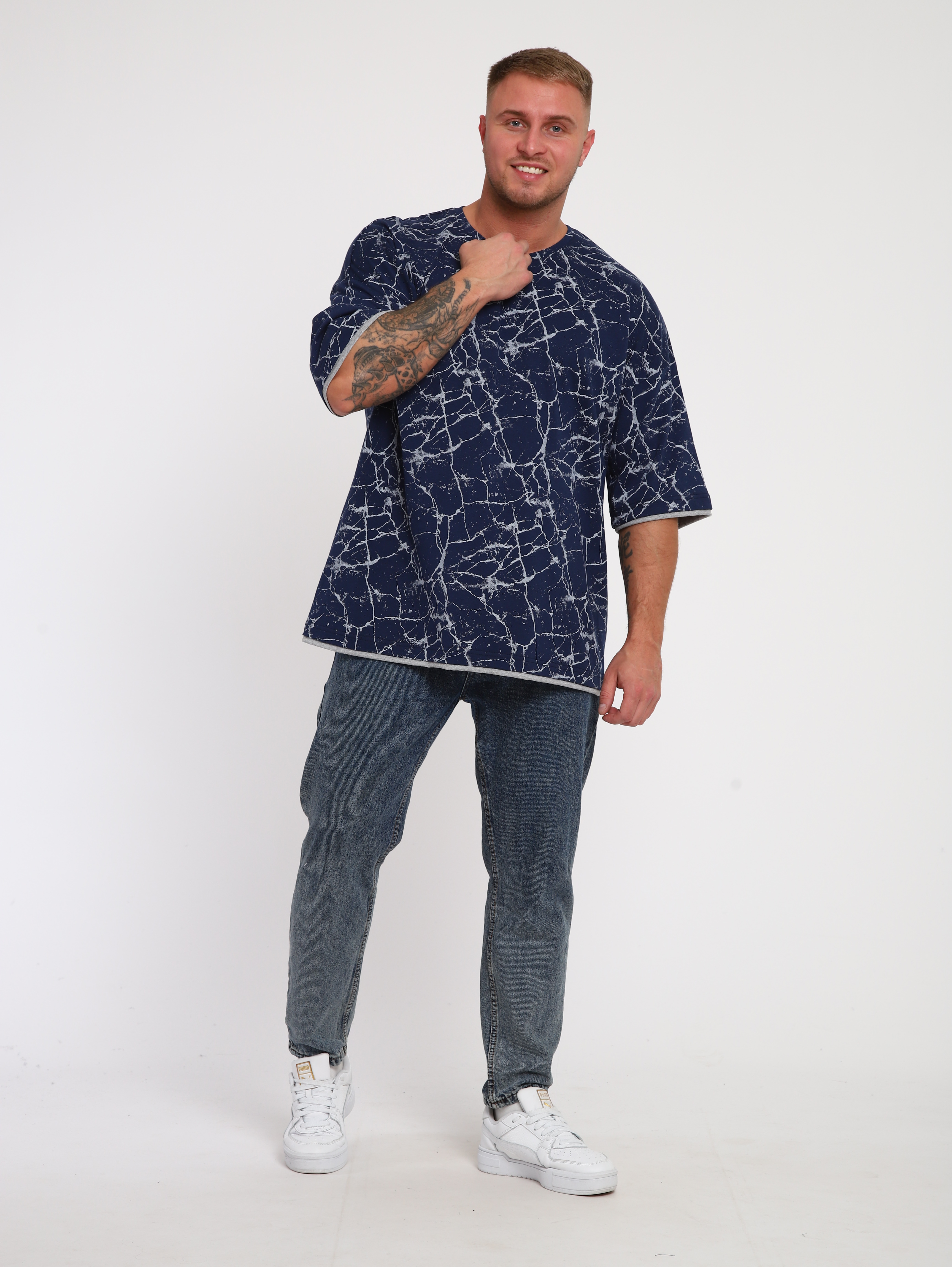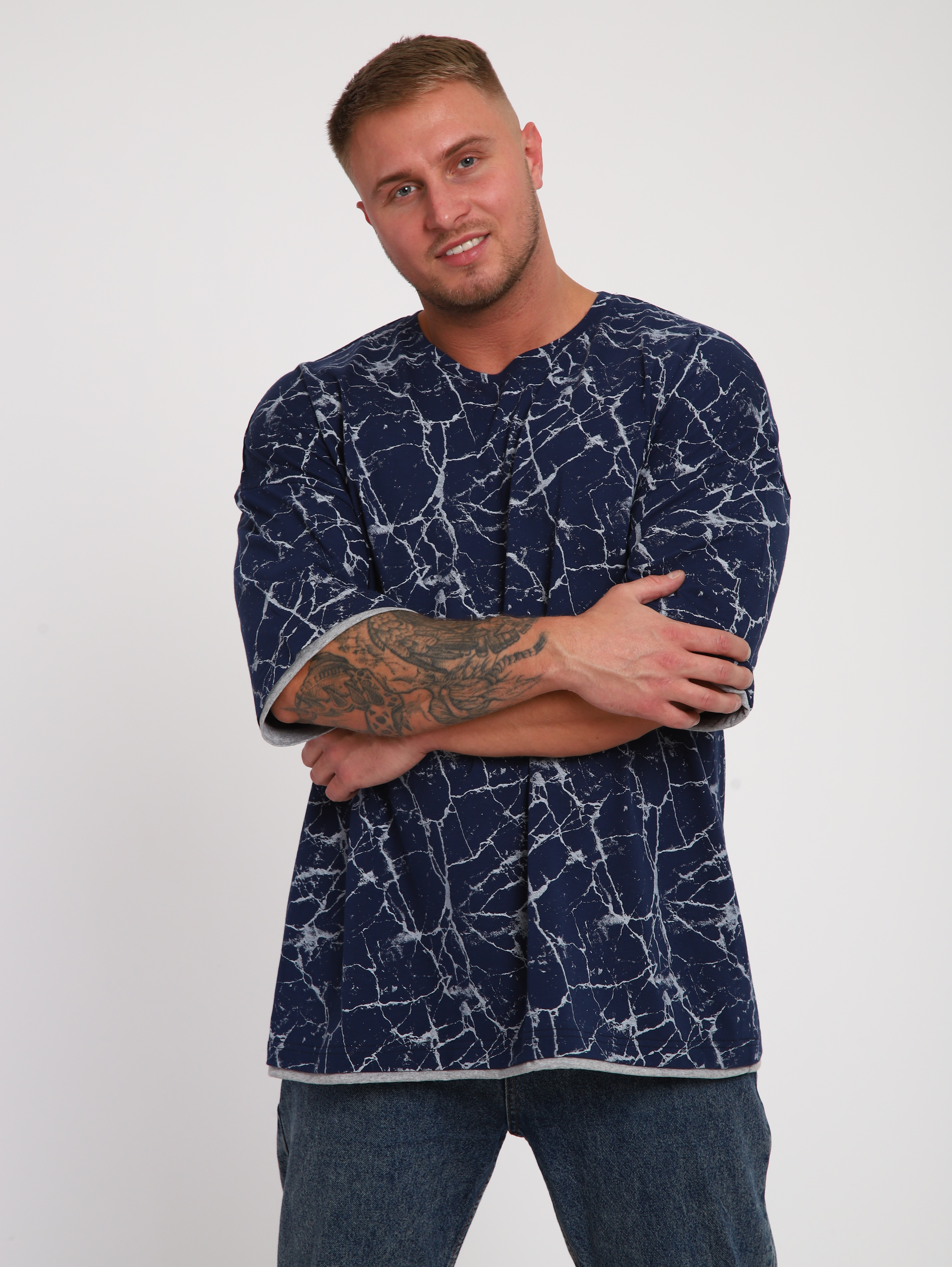 Мужская футболка в стиле oversaiz с контрастной отделкой на рукавах  и по низу футболки. Свободный крой, удлиненный втачной рукав и спущенное плечо подарит ощущение легкости и полную свободу движений. Ткань кулика с набивным рисунком.