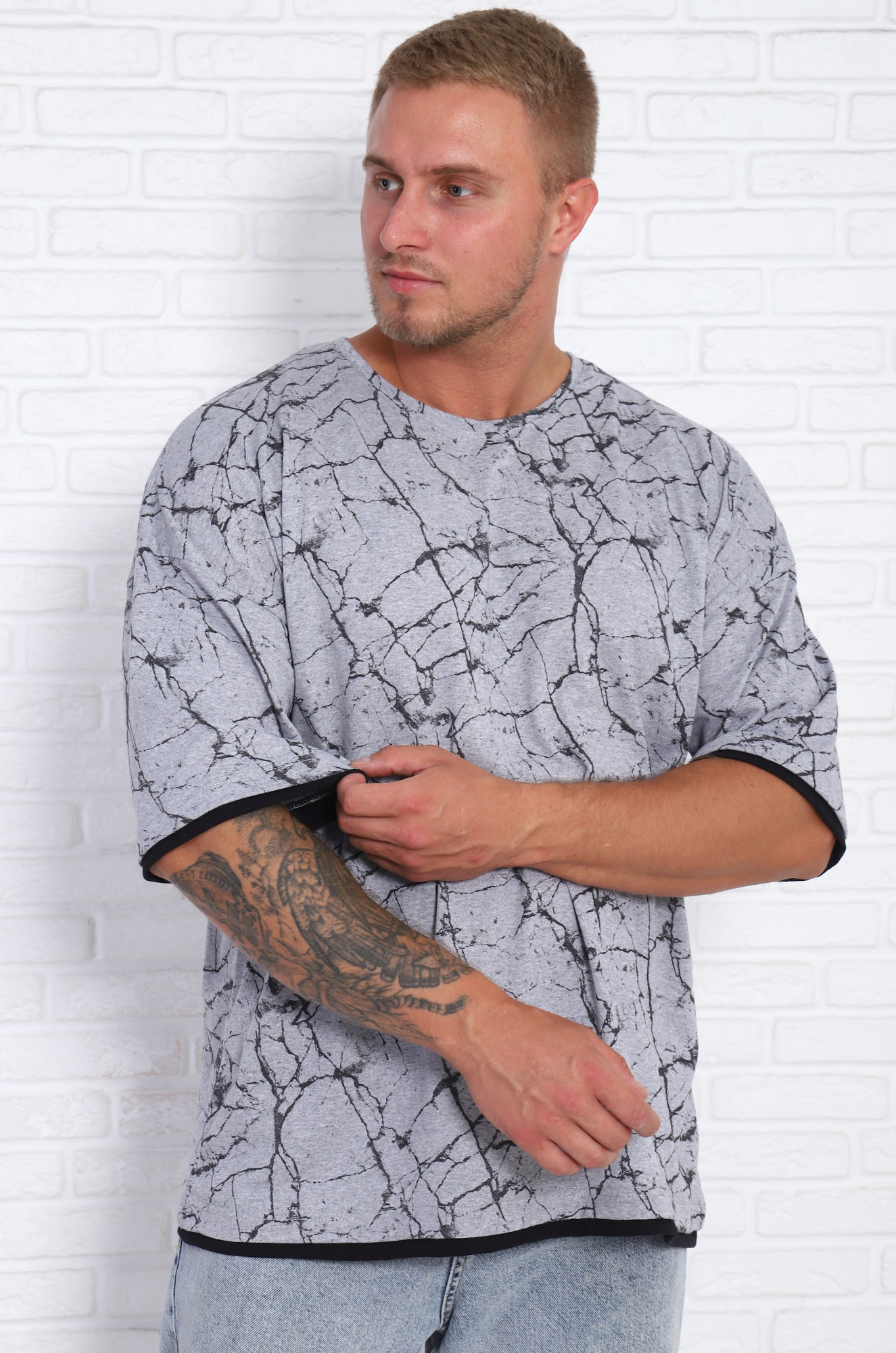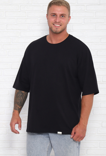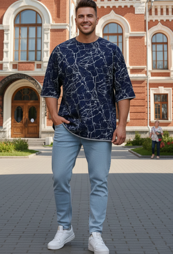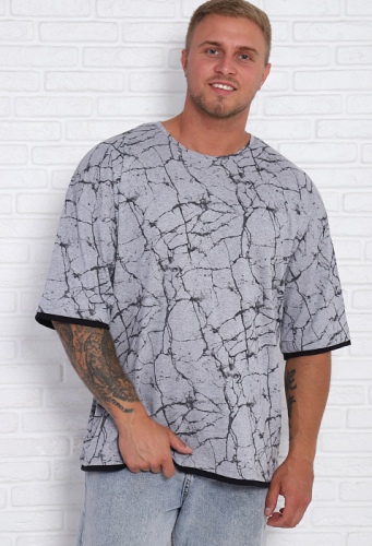 Мужская футболка в стиле oversaiz с контрастной отделкой на рукавах  и по низу футболки. Свободный крой, удлиненный втачной рукав и спущенное плечо подарит ощущение легкости и полную свободу движений. Ткань кулика с набивным рисунком.