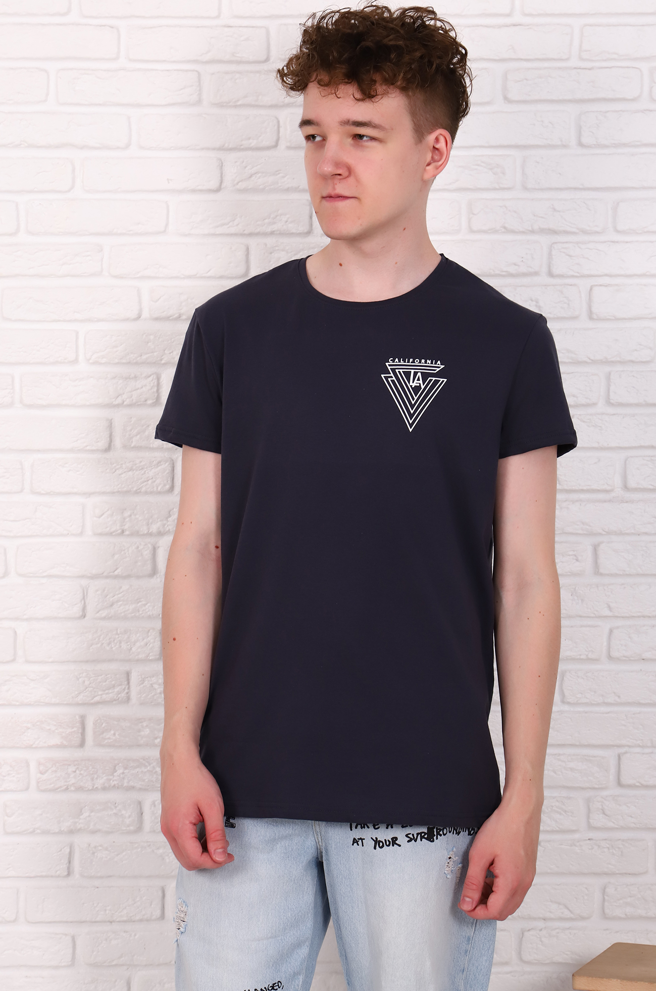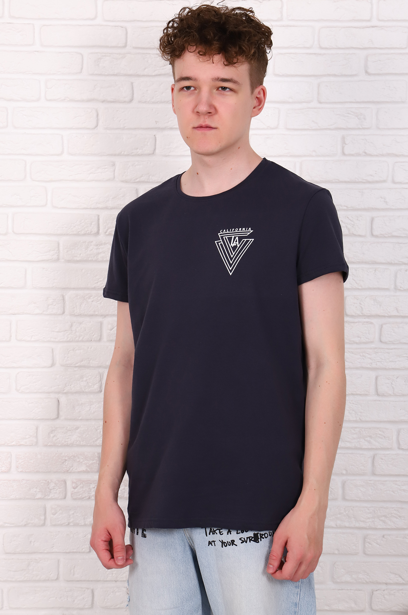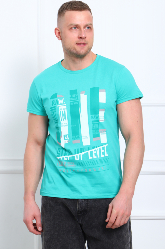 Стильная хлопковая футболка для мужчин. Модель классического, прямого кроя, с втачным рукавом. На груди небольшой печатный принт.