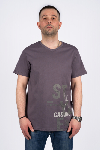 Футболка классического прямого кроя идёт всем и легко сочетается со свободными джинсами, спортивными брюками и шортами. Мягкий дышащий материал ― не слишком плотный и не слишком тонкий. Прямой силуэт футболки, втачной рукав, горловина V-образная, обработана воротником из рибаны. Горловина спинки внутри укреплена настрочной планкой из кулирки. Низ изделия и рукавов обработан швом в подгибку. На полочке принт шелкография.