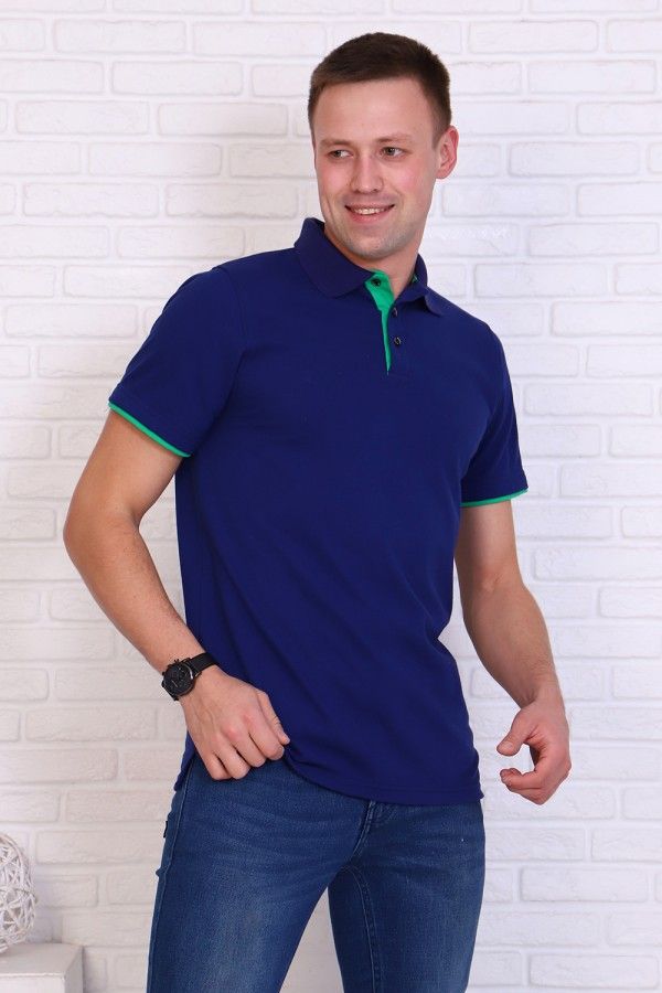 Футболка поло мужская из ткани лакост пенье 100% хлопок насыщенного синего цвета. Воротник вязаный в цвет футболки, отделка на рукаве и планка яркого контрастного цвета, по бокам разрезы. Планка застегивается на 3 пуговицы. Футболка удобная и комфортная, подойдет для повседневной носки, прогулок и отдыха, после стирки сохраняет цвет и форму.