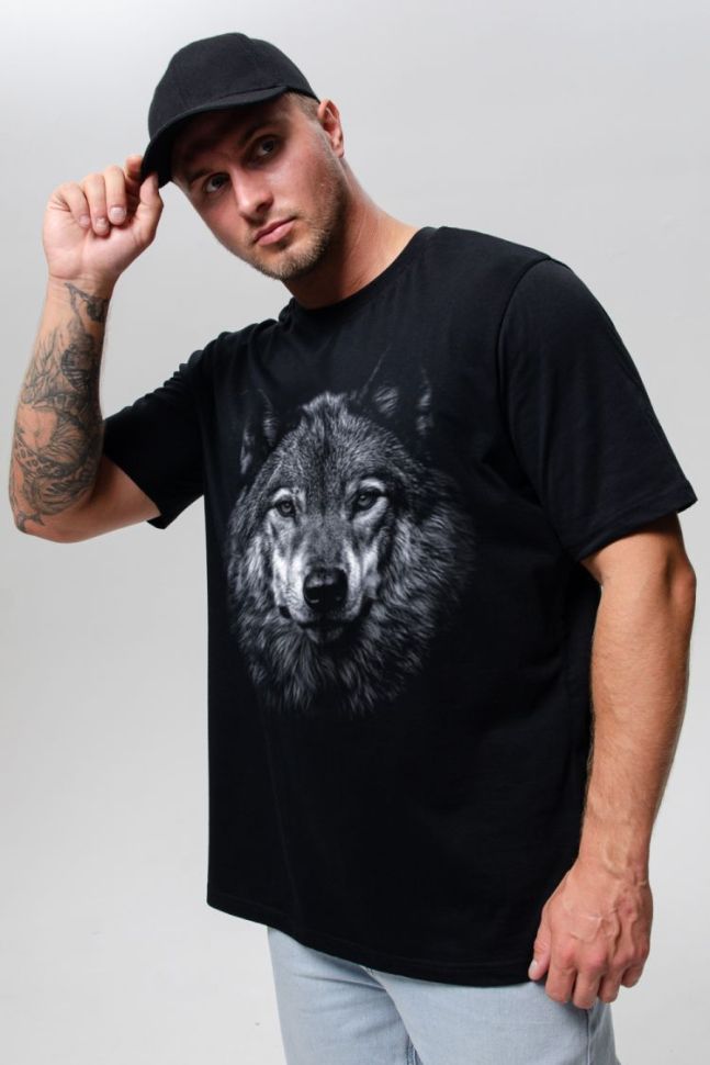 Футболка прямая, свободная, средней длины, с округлой горловиной. Рукав короткий. Горловина обработана эластичной обтачкой. Изображение волка возможно другое.