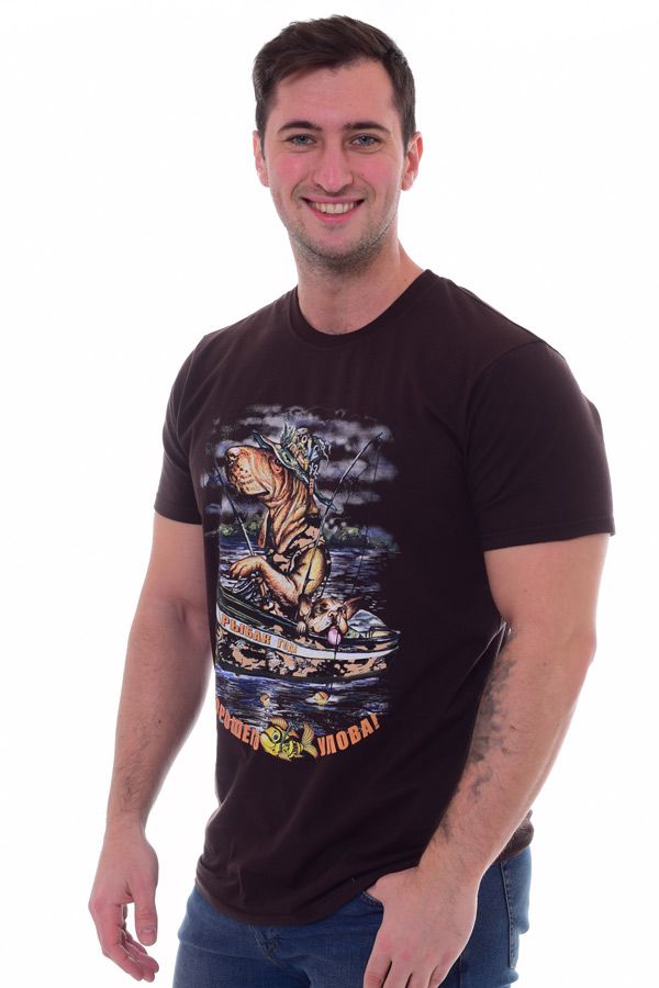 Стильная футболка мужская из кулирки. С печатным принтом на полочке. Горловина полукруглая. Рукав подгибка. Длина изделия 50 размера: длина по спинке - 74 см.