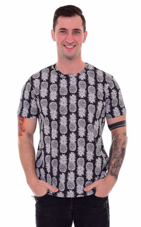 Футболка свободного покроя с коротким рукавом из ткани с принтом «ананас». Длина изделия по спинке 46-70 см, 48-71 см, 50-72 см, 52-72 см, 54-75 см, 56-76 см, 58-77 см, 60-78 см.