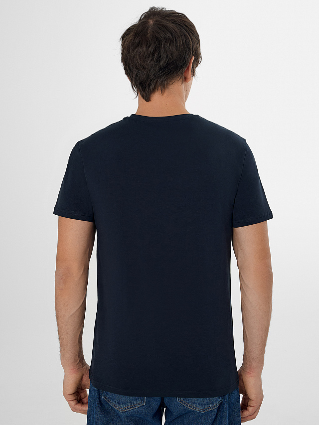 Синяя мужская базовая футболка — это универсальная модель прямого кроя для повседневной носки. Она выполнена из хлопка с добавлением эластана, который обеспечивает мягкость, эластичность и комфортное прилегание.
