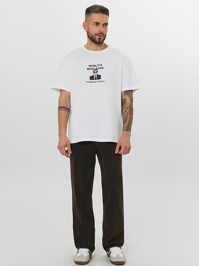 Белая футболка с принтом и надписью «Лучший босс в мире. Руками не трогать» — это стильное проявление чувства юмора. Её свободный крой со спущенным плечом обеспечивает расслабленную и комфортную посадку, позволяя принту стать центром внимания.