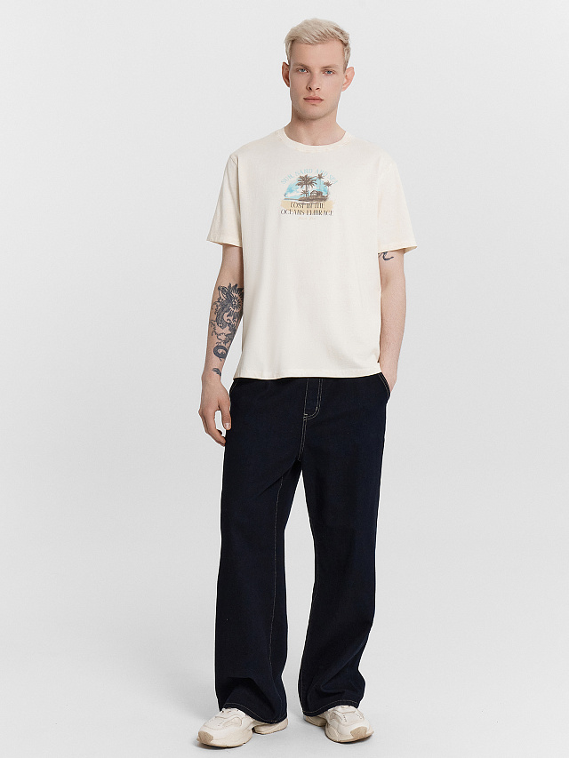 Футболка мужская бежевая с принтом и надписью "Lost in the oceanc embrace"
