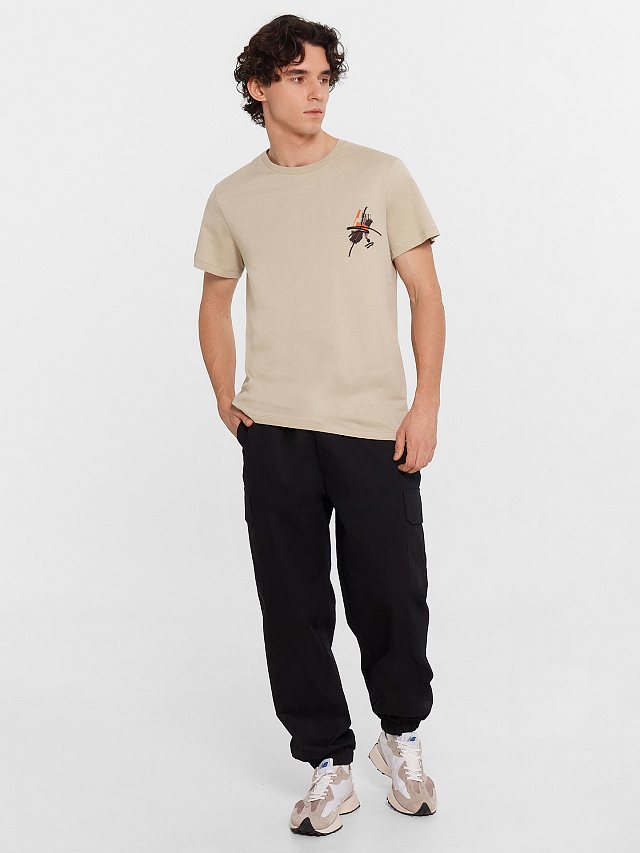 Футболка мужская бежевая с принтом и вышивкой на груди