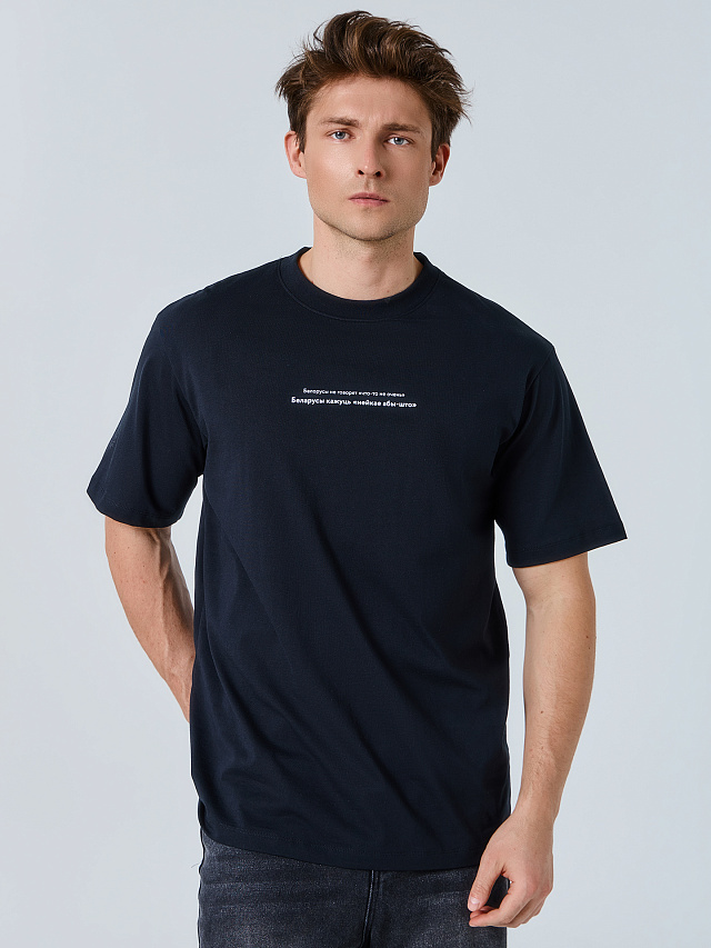 Черная мужская футболка с надписью «Белорусы не говорят "что-то не очень". Беларусы кажуць "нейкае абы-што"» —это модель для любителей локального юмора. Её свободный крой с круглой горловиной и короткими рукавами обеспечивает комфортную, расслабленную посадку.