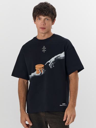 Прямой силуэт без боковых швов создаёт чистый и лаконичный вид, а круглая горловина и короткие рукава делают футболку универсальной для любой активности. Юмористичная надпись и узнаваемый художественный мотив добавляют образу игривости и тематической завершённости.