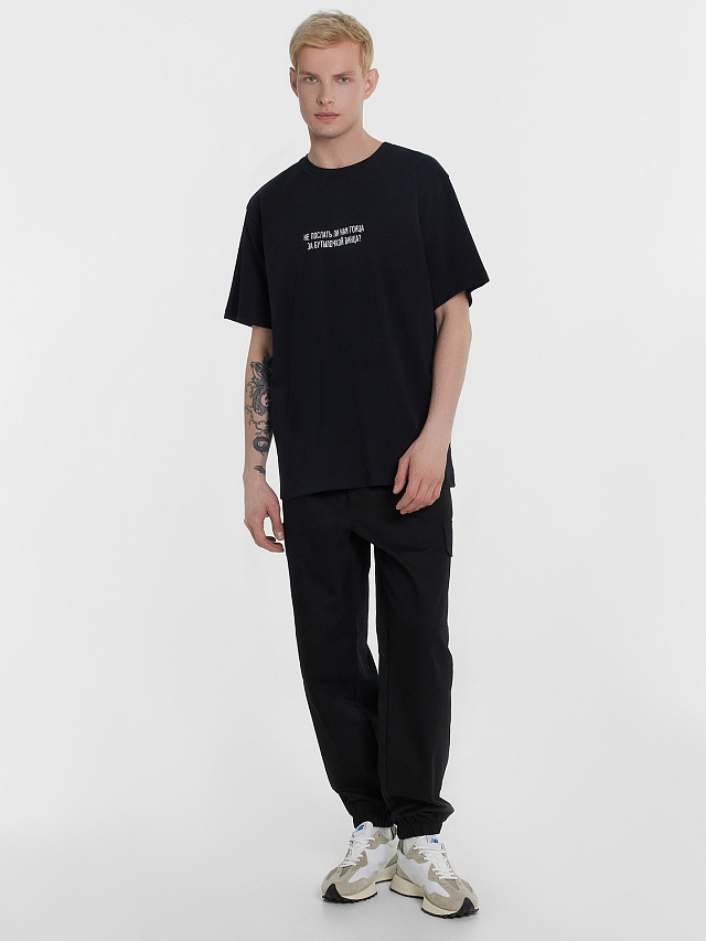 Футболка мужская черная с надписью "Не послать ли нам гонца за бутылочкой винца"