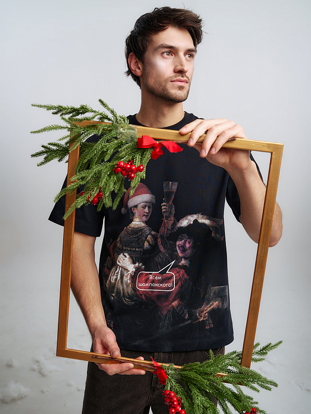 Черная мужская футболка с принтом создаст праздничное настроение. Надпись «Всем шампанского!» сразу задает веселый тон и выражает готовность к празднику.