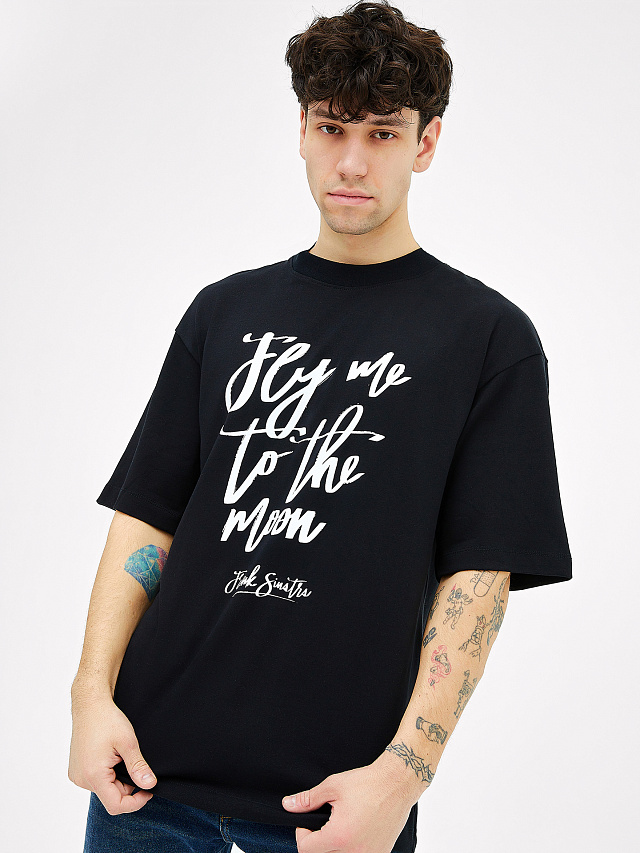 Оригинальная футболка мужская из высококачественного хлопка с принтом в виде цитаты из песни Фрэнка Синатры "FLY ME TO THE MOON". Длина до середины бедер, свободный прямой силуэт, горловина круглая, линия плеча немного спущена, рукава короткие. Сохраняет свой насыщенный цвет и качество даже после многократных стирок. Обладает хорошей устойчивостью к выцветанию и отлично держит форму. Подойдет для повседневной носки и поможет создать стильный городской образ, а также для занятий спортом. Данная мужская майка позволяет достичь идеального сбалансированного сочетания между комфортом и стилем. Если вы ищете универсальную футболку высокого качества, то данная модель точно соответствует вашим требованиям. Рекомендуем!