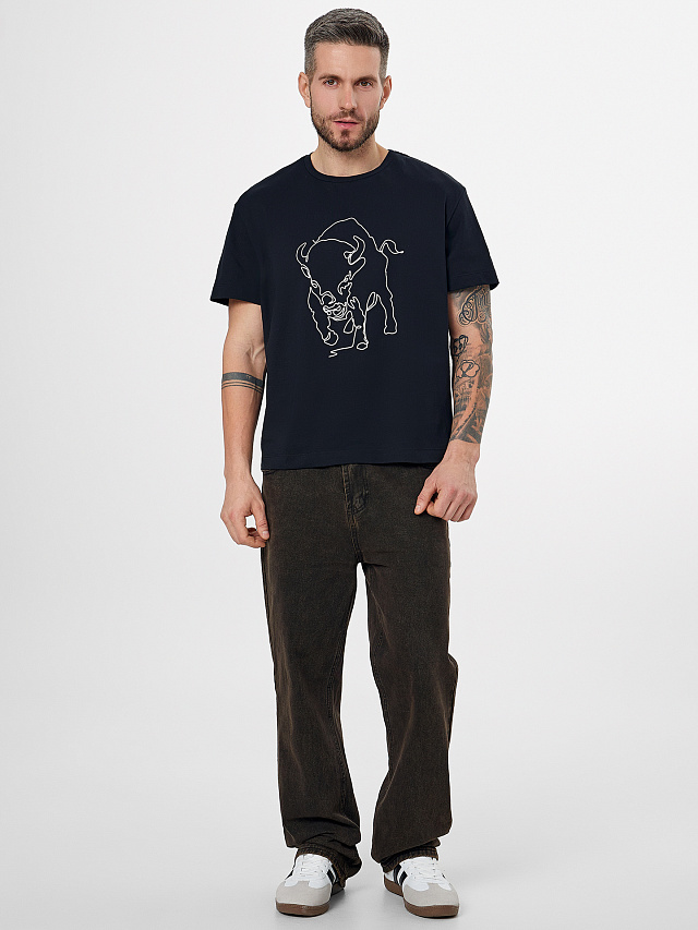 Черная мужская футболка с принтом зубра — это стильный способ подчеркнуть свою силу и индивидуальность. Модель прямого кроя из мягкой кулирной глади обеспечивает комфорт в течение всего дня.