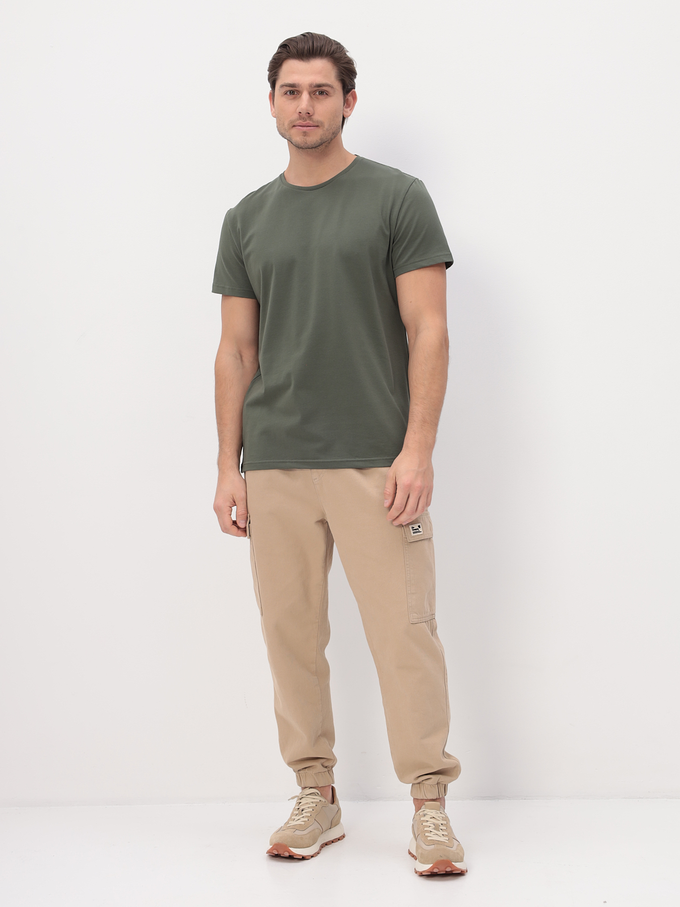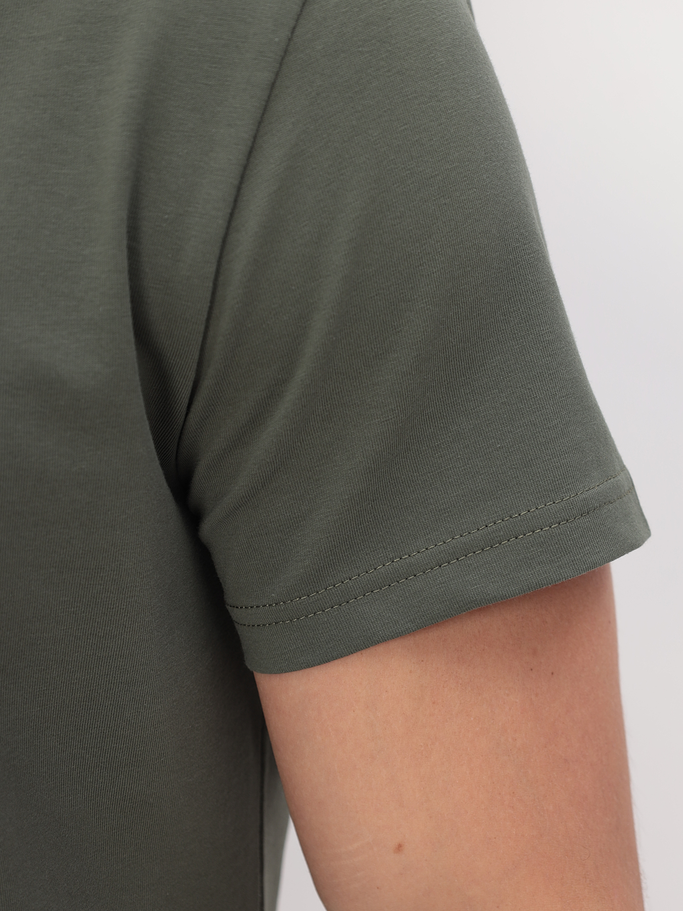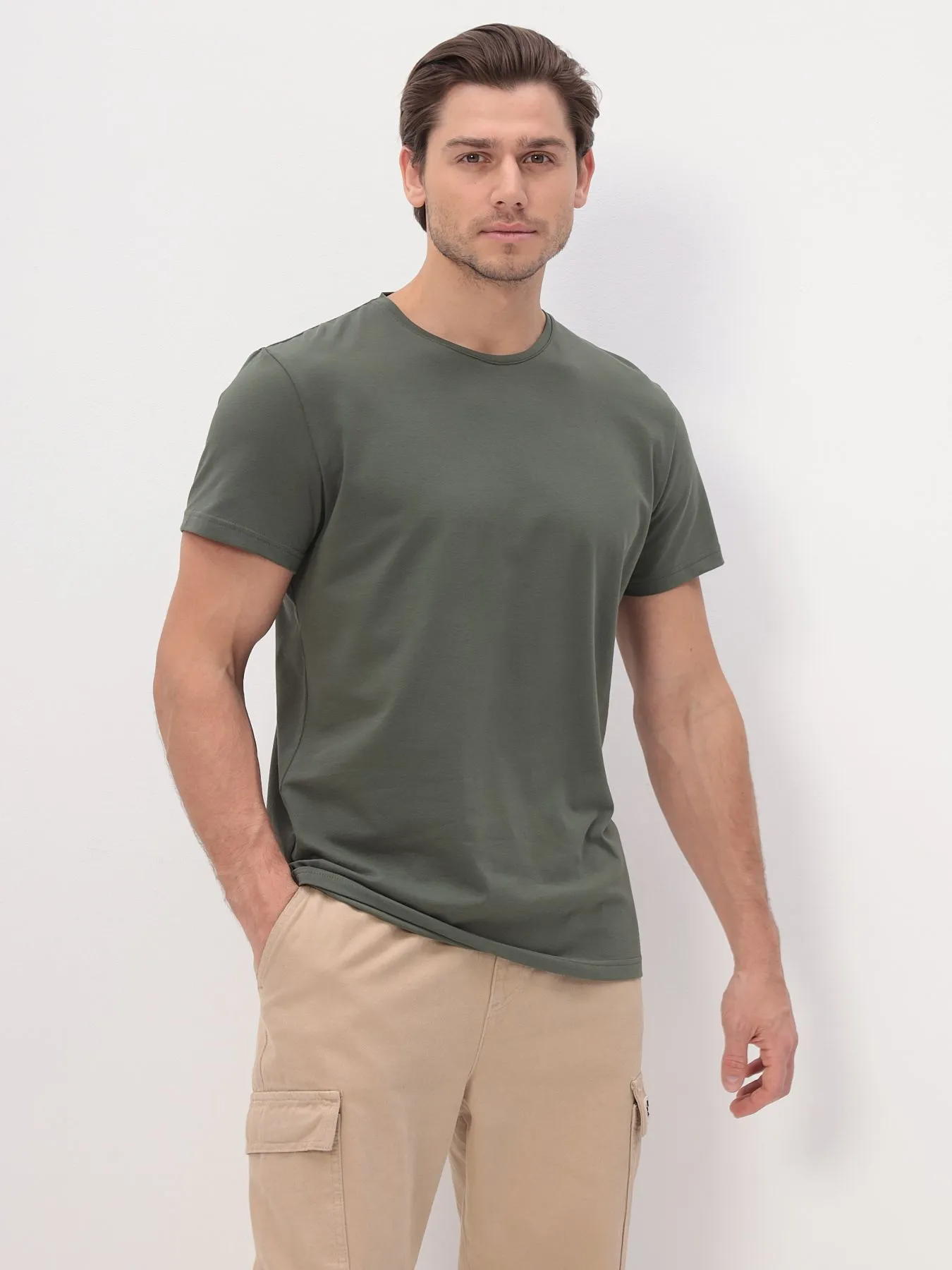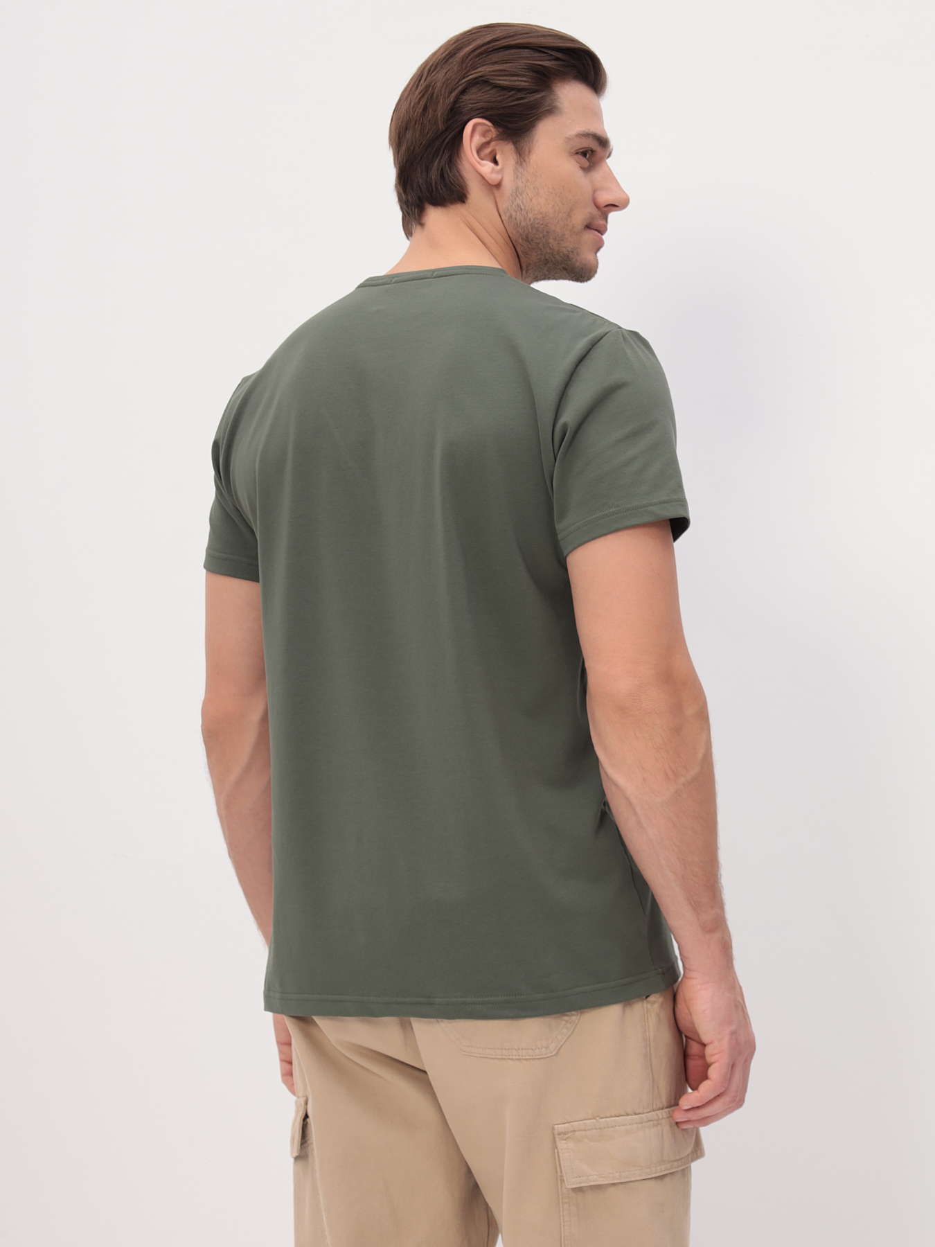 Цвет: Хаки Рисунок: Без рисунка..показатьli> Состав: 92% хлопок 8% эластан Модель: Классическая Ворот: Круглый Караман: отсутствует Силуэт: Прямой силуэт / Сlassic fitli>