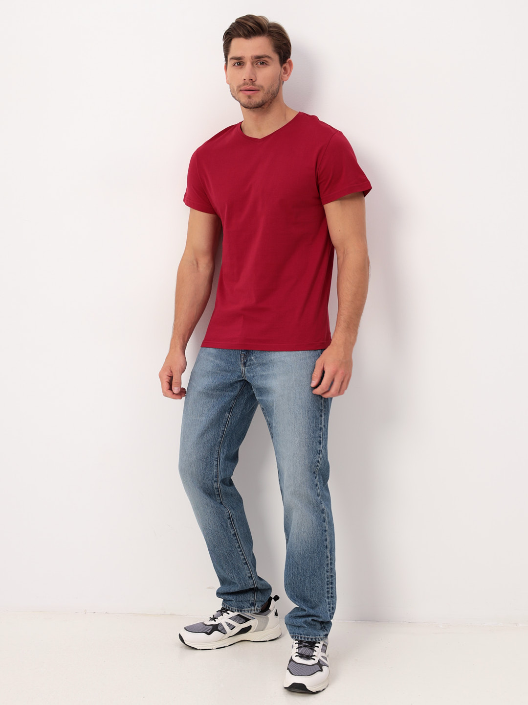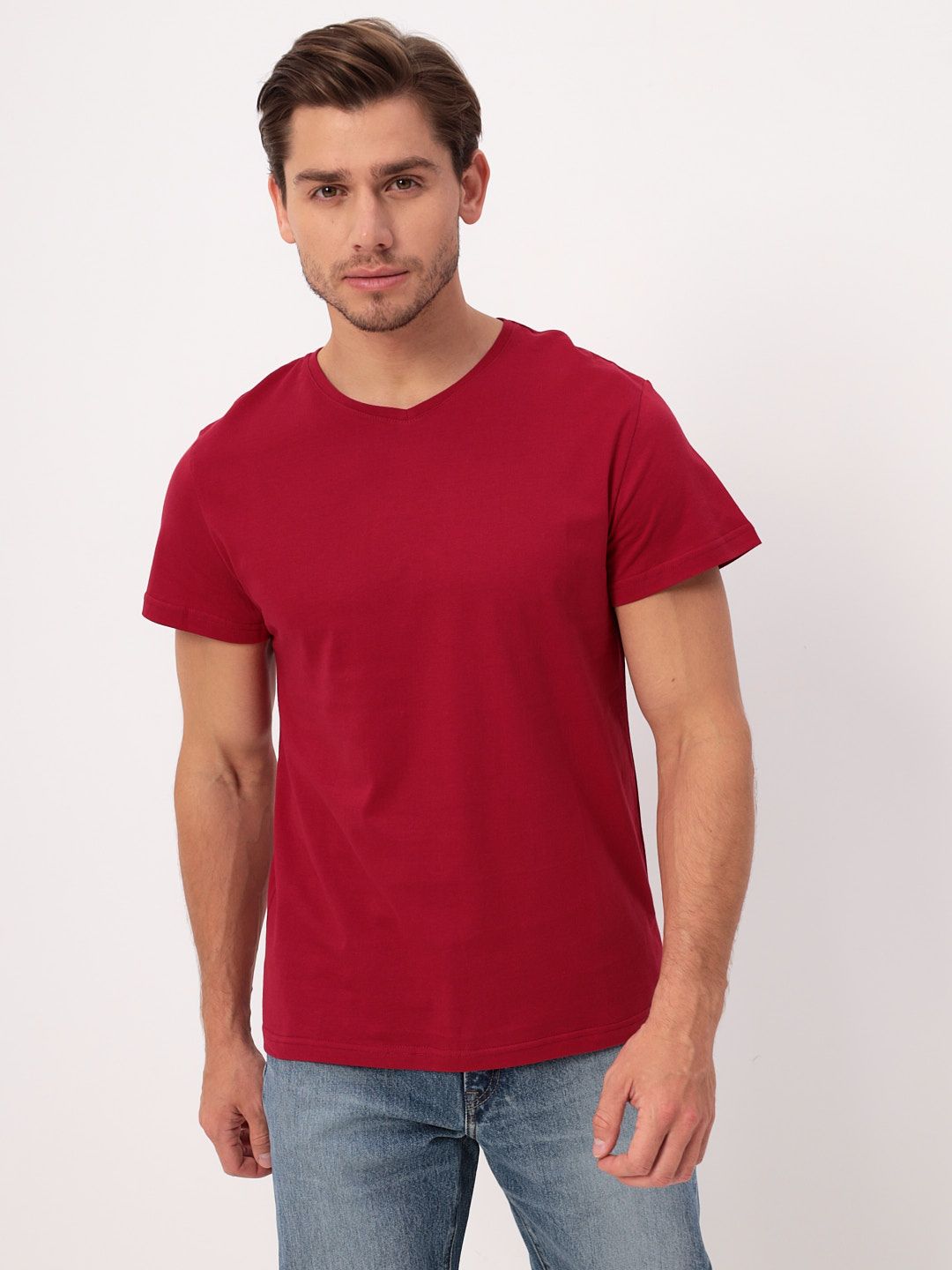 Цвет: Красный Рисунок: Трикотаж о..показатьднотонный Состав: 100% хлопок Supreme Модель: Классическая Ворот: V-вырез Силуэт: Прямой силуэт / Сlassic fitднотонный
