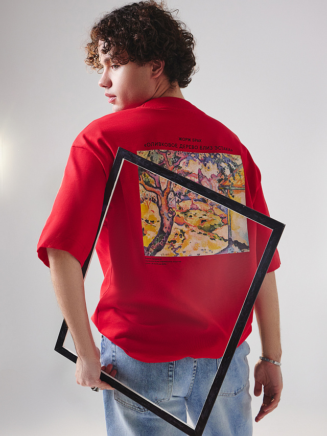 Футболка мужская красная с принтом Жорж Брак "Оливковое дерево близ Эстака"