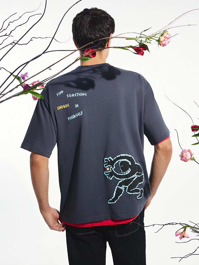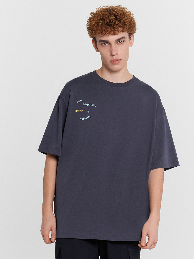 Футболка мужская серая с принтом и надписью "find something unique in yourself"