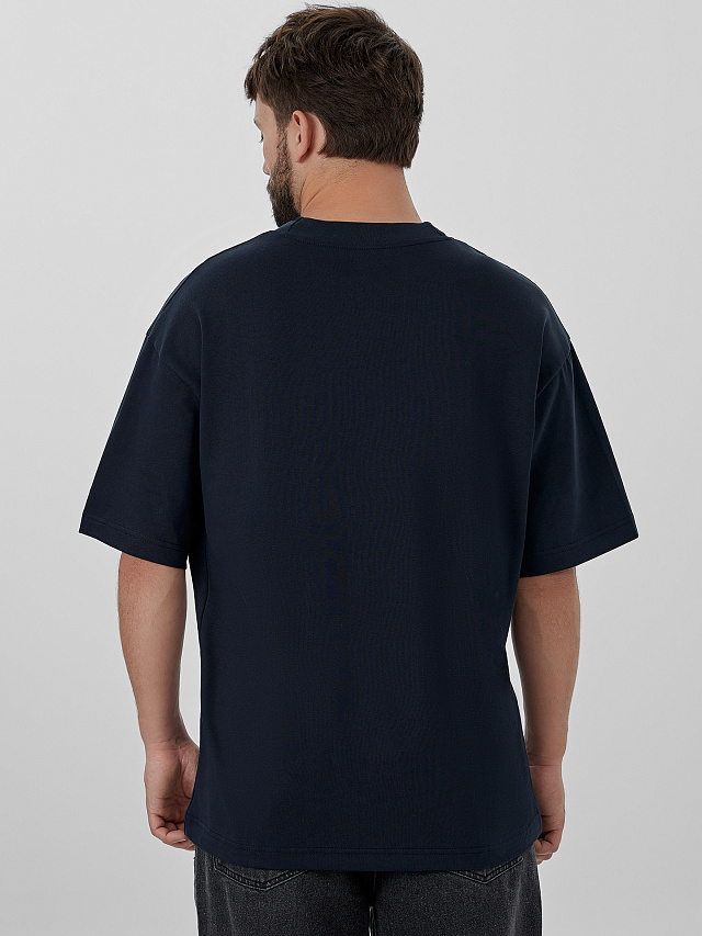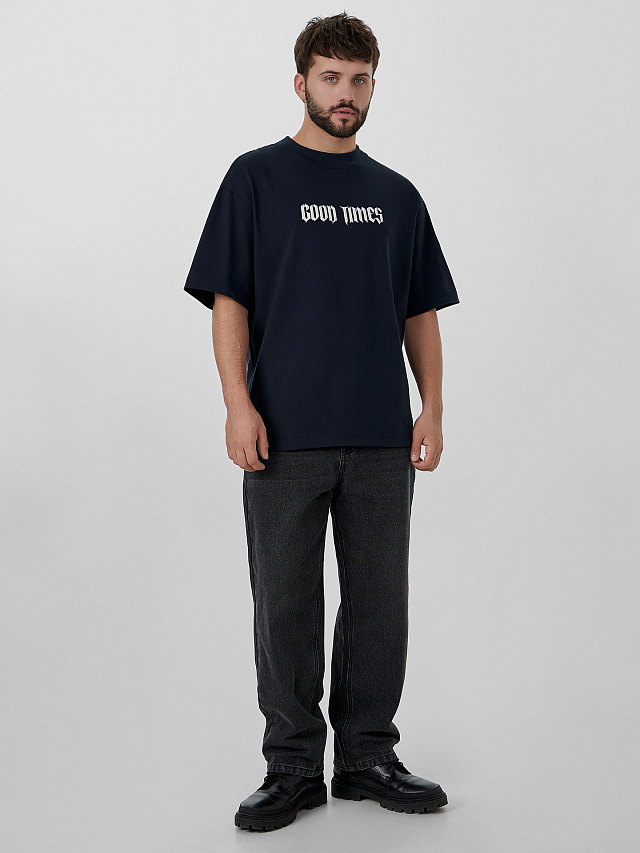 Синяя мужская футболка с надписью «Good times» («Хорошие времена») создана для тех, кто ценит стиль и комфорт. Модель оверсайз со спущенной линией плеча и короткими рукавами легко сочетается с любым низом.