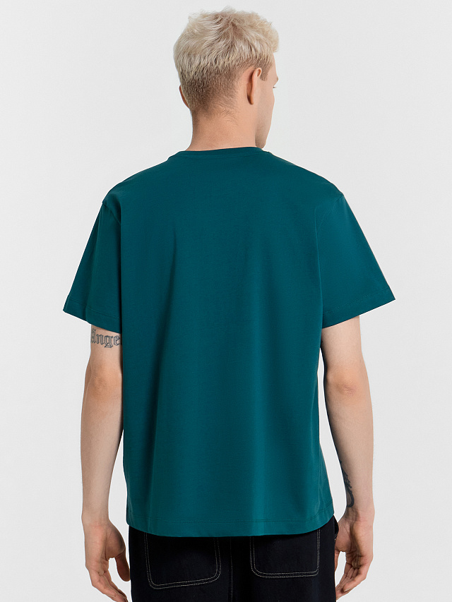 Нижние срезы футболки и рукавов обработаны швом вподгибку.